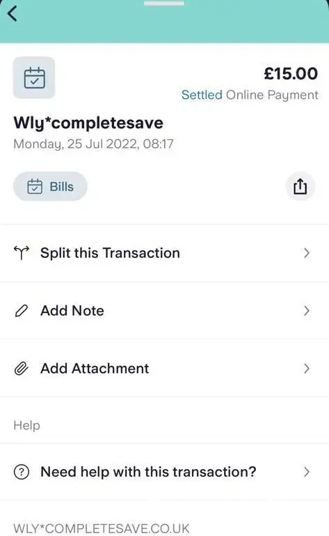 I was debited £15 by wly* complete save on the 25/07/2022, 08.17am from my starling bank account. I have never authorised such payment and would not want this transaction. I wish to get a refund of my £15 back into my account please. there was no transaction that occurred or any authorisation given for the payment. I just checked my bank app and noticed I got debited £15 by wly* complete save.