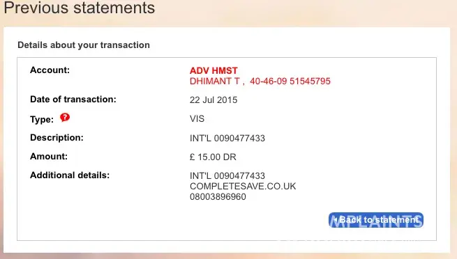 I checked my bank account transaction last week and it seems that complete savings co UK has been withdrawing 15 pounds per month from my bank, in the last 8 months, taken from my account and none of these payments were authorized by me. They slipped past my attention because the amount was only £15.