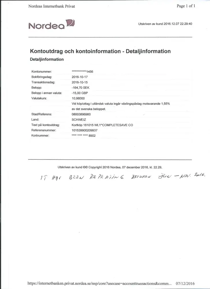I am enclosing November statement from Nordea a Swedish bank. This has been going for six months amount was not large so I did not notice, I do not use that card that much any more now .