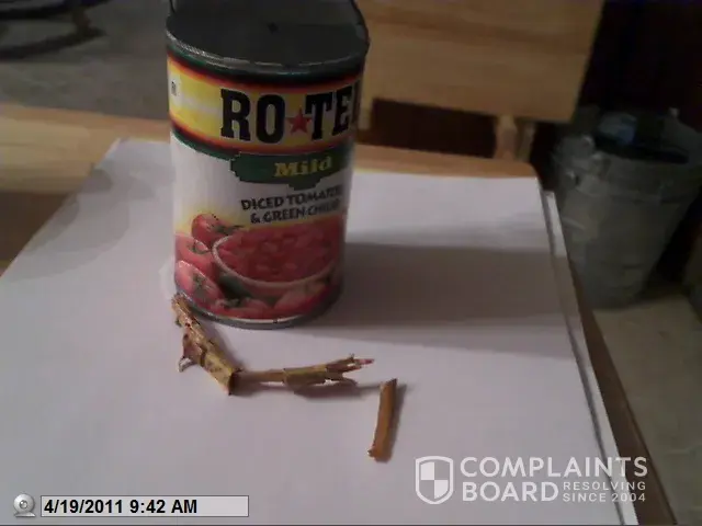 I'm Tara and I work for ConAgra Foods and we make RoTel. I'm so sorry to hear of your experience. We do have preventive measures in place in our manufacturing facilities to prevent these types of things from happening but I'm going to be sure to send the details of your experience to our quality team for review. I'd really like to get some more details from the can and see if there is something I can do to make this up to you. Please email me at [protected]@conagrafoods.com at your convenience.