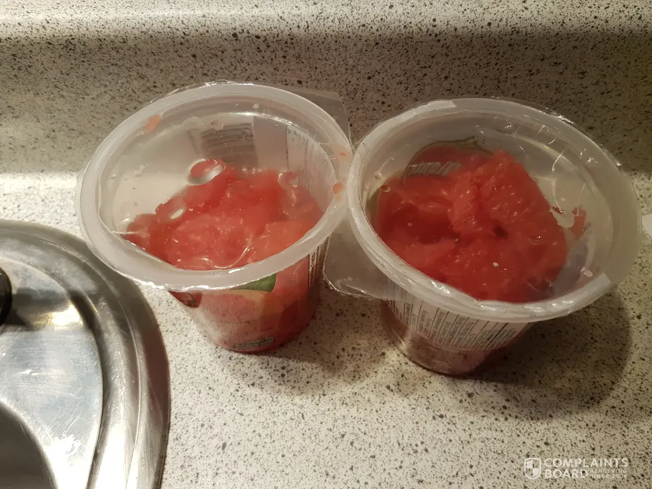 I had bought a box of 8 red grapefruit cups from superstore in simcoe ontario canada. When opened 2 days after buying I had noticed that 1 had leeked out making the bottom of box all soggy and another one the top of it was bowed up like it was going to explode soon. I opened that one to find it smelling fromented and tried it and it was bad. This is not the first time I have bought this 8 pack product to find some already spoiled or not sealed. I have pictures and codes that I will attach. It is march 4th and the product code on bottom is 2019 ma 08 so they are not expired yet.