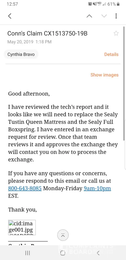 On saturday morning, 4/27, my mom forwarded me an email (attached) that conn's had sent her. I called the number on the email.