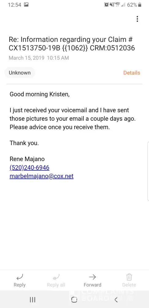 I sent the pictures as requested at the start of the claim on March 13 and I have email confirmation of when the Technician showed up to my house to evaluate. A week or so went by and I called Conn's to find out about any update and I was told that they had not received the Techs report so pretty much if I hadn't called for an update nothing would have been followed up on and there was the first delay.