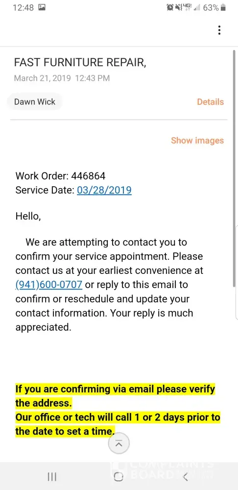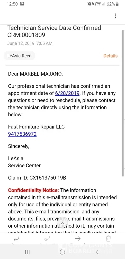 Fast forward to march of 2019, I called the conn's furniture service department in my area. Webster, tx store #266. I was told parts were ordered. Nobody told me these parts would be shipped to my home address and that I would have to call them to set up a repair appointment. 3 days later, I received what appeared to be packaging and foam wrapped in tape from somebody we did not know. My wife tore through the foam looking for something and eventually threw it out. 2 days later, my wife received an email stating the "part" had been delivered or would be delivered soon. Are you kidding me!? Now I get notified!?