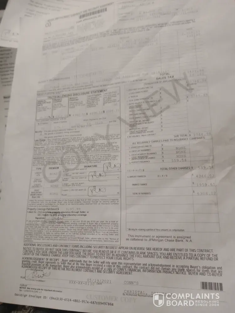 all wrongdoing. When sales associate person darnella christal told me that I was covered fully whether it is accidental damage physical damage breaking burglary fire whatever that means I'm covered and when I'm told that the company needs to stand by their guarantee they're not doing that which is why I'm also aware that snap finance progressive finance and several other companies are dropping conns because of their business practices I mean the guarantees a guarantee to this day the TV has not been fixed and my account is still in good standing condition I would advise people to find somewhere else to shop there are so many people that have messed up washers dryers that work for 2 weeks and then stop working this stuff is supposed to be brand new how do we not know if any of this stuff is refurbished? Their customer service is absolutely horrible especially when it comes to there service department they are rude they are misinformed and no one communicates within the company I was misled as a customer I will never do business with these people ever if anyone decides they want to do business with people who cannot uphold their guarantee on a product that they sell a customer only to be redirected and deflected without stating in their contract which is not covered although your sales representative tells you that you are don't believe it because you're not you will get sold and extended warranty and sent on your way thank you you're covered they charged me $559.54 for extended warranty which brings the total amount of the TV to $3, 999 and this is for a 75-in Qled TV which they refused to repair not only that but when you call the insurance company they have no record of me at all but yet I have the paperwork for it and the receipts to prove it one pissed off customer a good one y'all just lost for life