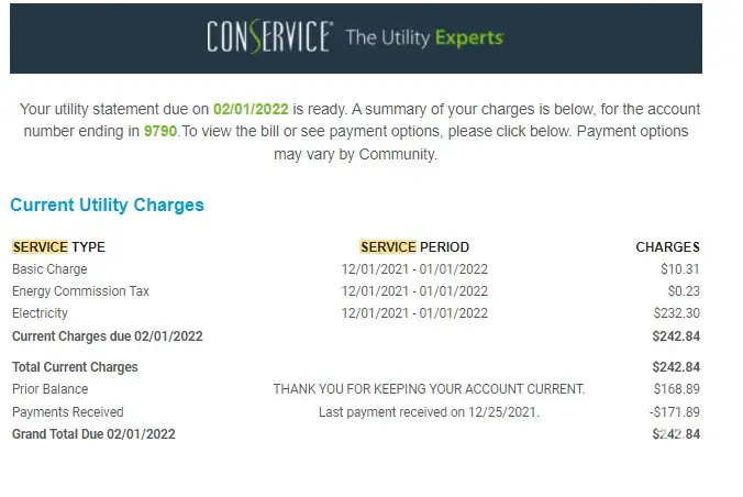 I use to pay 35$ a month to Conservice and the most I payed was 60$ a month. Now the bill has rocketed as high at 242.84$ a month and if not payed by the first they charge an additional 10 dollar late fee. I have emailed and complained to them many times on that something is wrong and the bill is so high that I don't understand why!?