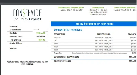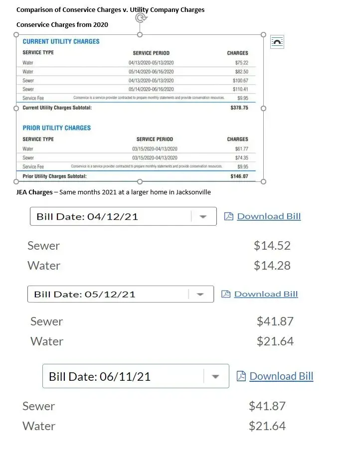 So I use to have Conservice and they totally ripped me off for over a year on water and sewage. I complained and never got a straight answer from them. The bills just got higher and higher with them. I've attached a photo that shows what Conservice billed in 2020 and what the actual provider of water and sewage billed at my new home in 2021 for the same months. As you can see from the photo, Conservice is billing more than double what the actual utility costs; yet they will tell you they are only billing you for the bill they get from the utility provider plus their "convenience" fee of $9.95 a month to bill you and pay your bill for you. Total bull! Conservice needs to be sued and needs to be shut down; the executives need to spend time behind bars.