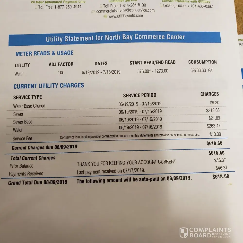 We have recently received a bill from Conservice claiming we have used 69, 700 gallons of water this past billing date 6/19/2019-7/16/2019. I called customer service and they claimed that they are charging us an average usage from April till the current period. This makes no sense as they have just recently became our utility provider. In the previous month they estimated our balance because they were unable to get a correct meter reading. They estimated our average consumption at 5, 300 gallons from 3/23/2019-4/22/2019. I would understand if there were to be a leak, but the customer service representative claimed that they are charging us for them miscalculating previous months and combining multiple months into one. She was unable to provide a bill that represents what she was claiming. Even so 5, 300 gallons a month doesn't come close to 69, 700 gal. That is over a years consumption based off 5, 300 gallons a month.