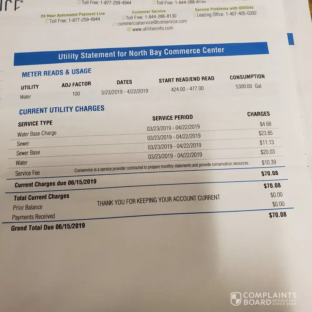 I wanted to add in on complaints about Conservice. Our utilities for our 2 bedroom apartment in downtown Los Angeles has steadily increased since our complex switched to Conservice. We are also required to pay utilities with the rent. I'm confused if it is the complex or Conservice that is causing this hike in utilities, I have read that apartment complexes are able to "rip you off" with utilities using Conservice as the billing company. In any case it seems there are enough complaints about this company for a series of years that class action suit should be in progress!