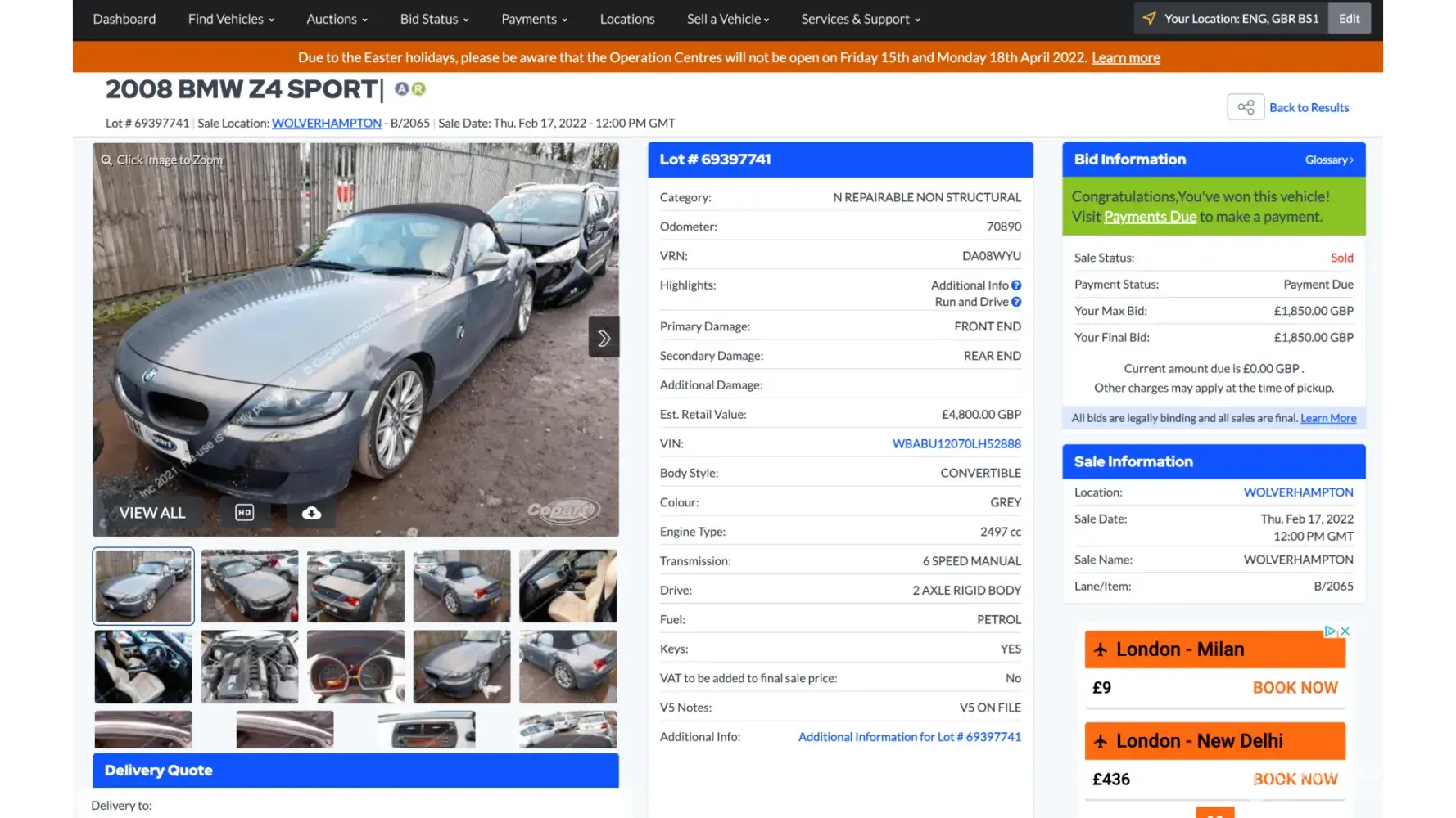 I bought a convertible BMW in MID February , 2022 from Copart Wolverhampton,UK .COPART listed the car as CAT N . I repaired the car and when I tried to list in on Autotrader to resale it auto trader wont allow me citing security issues . When I did a HPI check on the cat it came as CAT B, scrapped . I am reporting this to Copart hoping that they will take full responsibility and not hide under their unfair terms of condition because I plan to refer this to the UK trading standard.