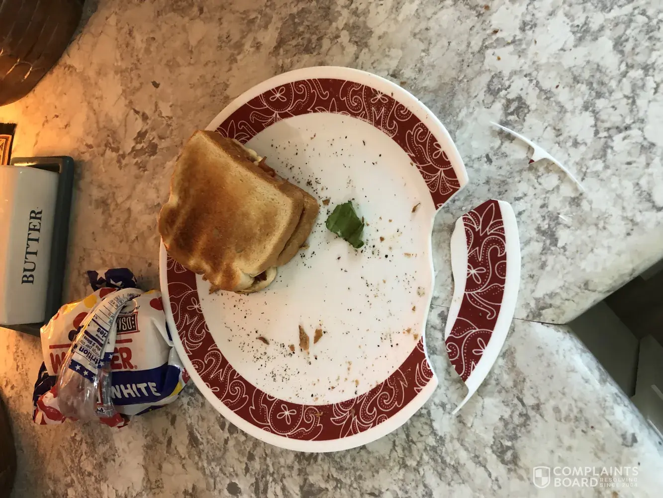 Just finished making myself a sandwich put it on the plate the doorbell rang the cable TV guy was here to help me with my TV service nothing hot on the plate just the sandwich with bread lettuce and tomato and mayo and bacon. TV guy was here about 20 minutes all of a sudden we heard this noise and turned around to look my Corelli dishware plate had broken all by itself and chipped off and went into a couple of pieces ?