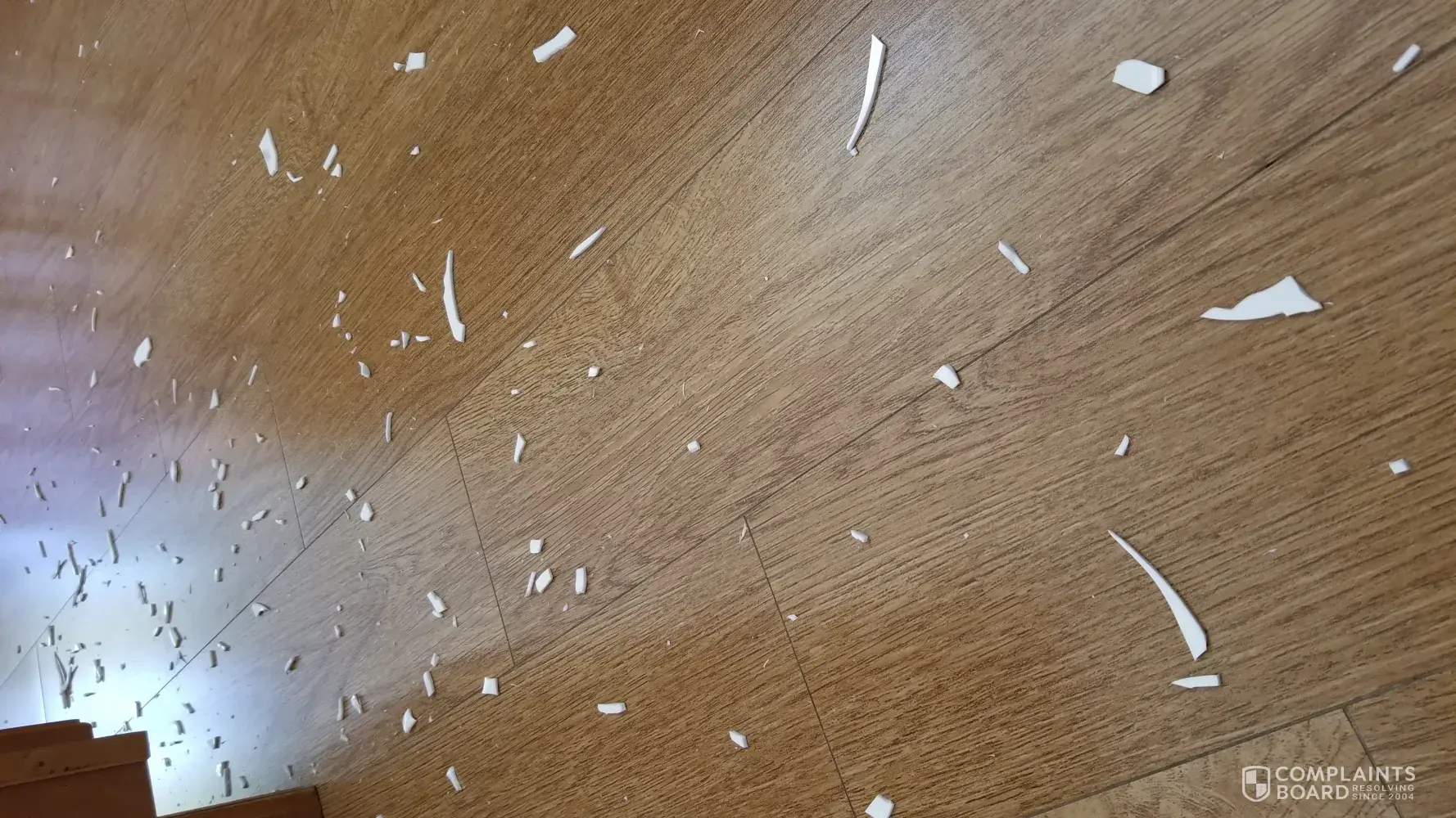 unpacked my dishwasher and a bowl splintered into two large and many little pieces. Some of shards got into drain pipe of dishwasher and now it needs fixing.