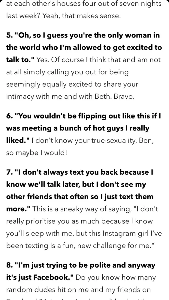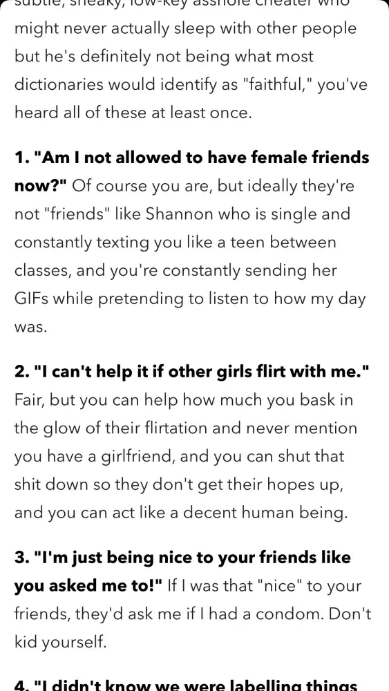 The latest cosmopolitan about 10 garbage excuses that micro cheaters use, I find highly sexist as it only points out about males being cheats where as women can also cheat! Men also read cosmopolitan not only women and feel victimised as they're targeted by cosmopolitan for being the "cheaters". As a women myself I still find it very sexist and there should be complete equality through genders on your articles!