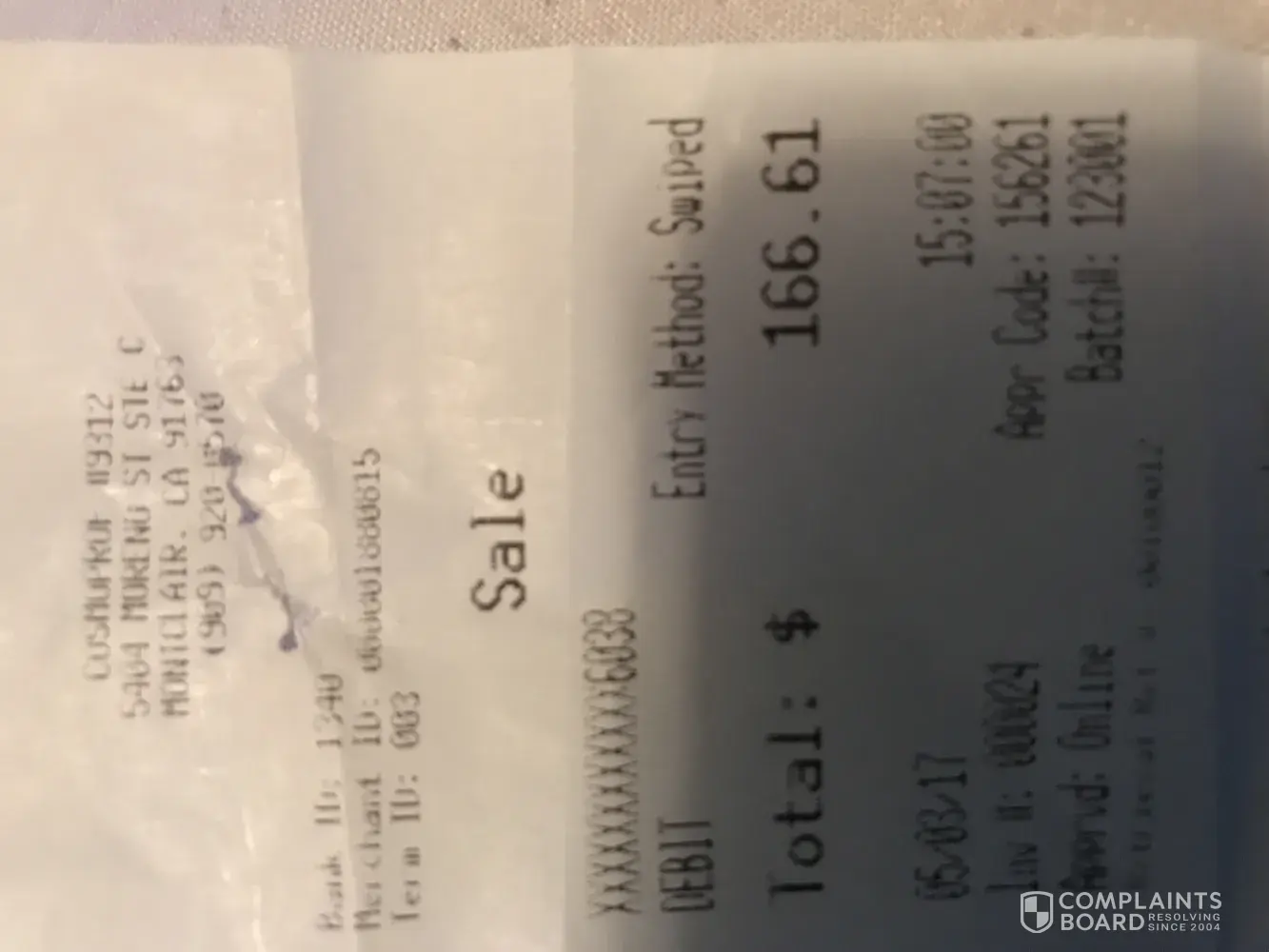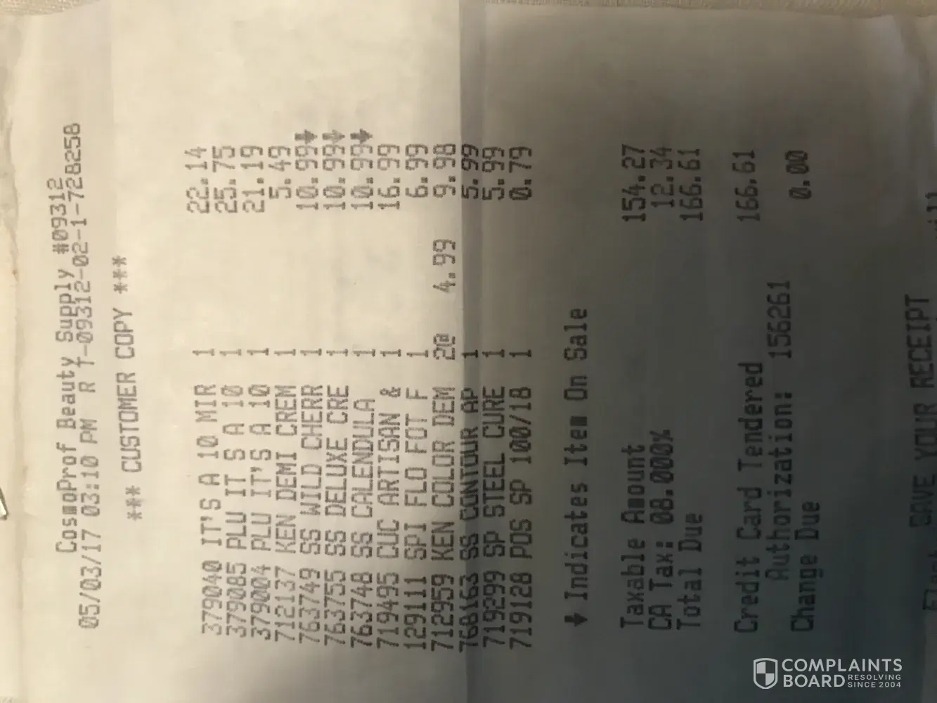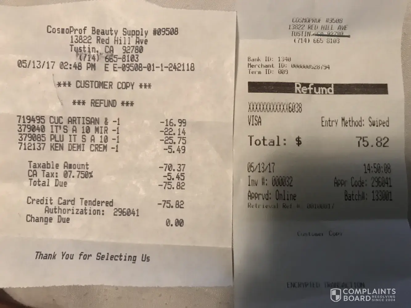 I went into Cosmoprof store #09508 on 05/13/17 at 02:48 pm to return items • #719495 Cuc Artisan •#379040 It's a 10 Mir •#379085 Plu It's a 10 •#712137 Ken Demi Crem