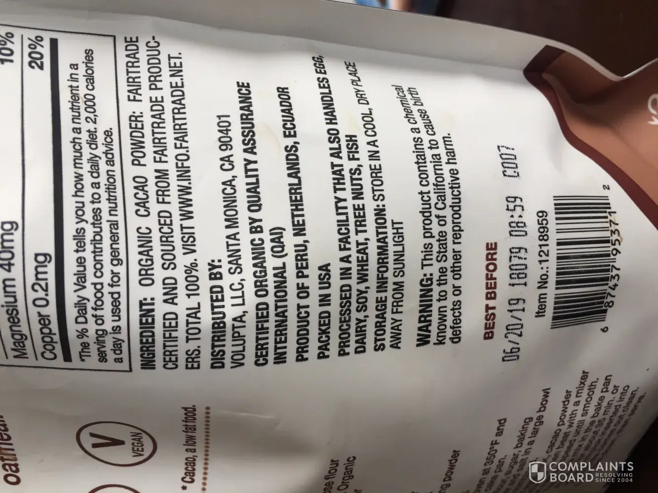 I have purchased a Volupta cacao powder at local Costco store and checked the label for ingridients. The cacao power was listed as the only ingredient. We have used half of the package as my wife noticed on the bottom of package a statement about a chemical contained in the powder that can cause reproductive health problems. A chemical inside the organic product? And the name of the checmixsl is Not explicitly listed ?