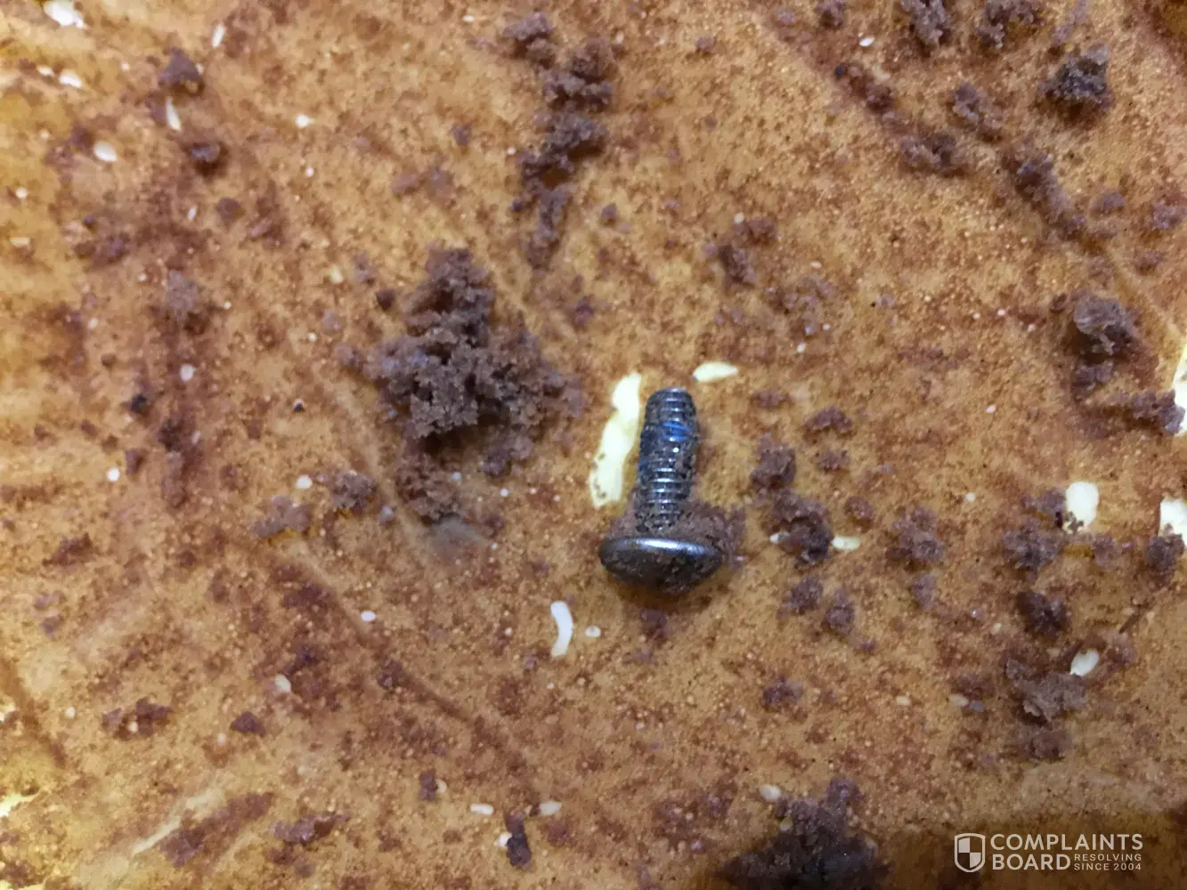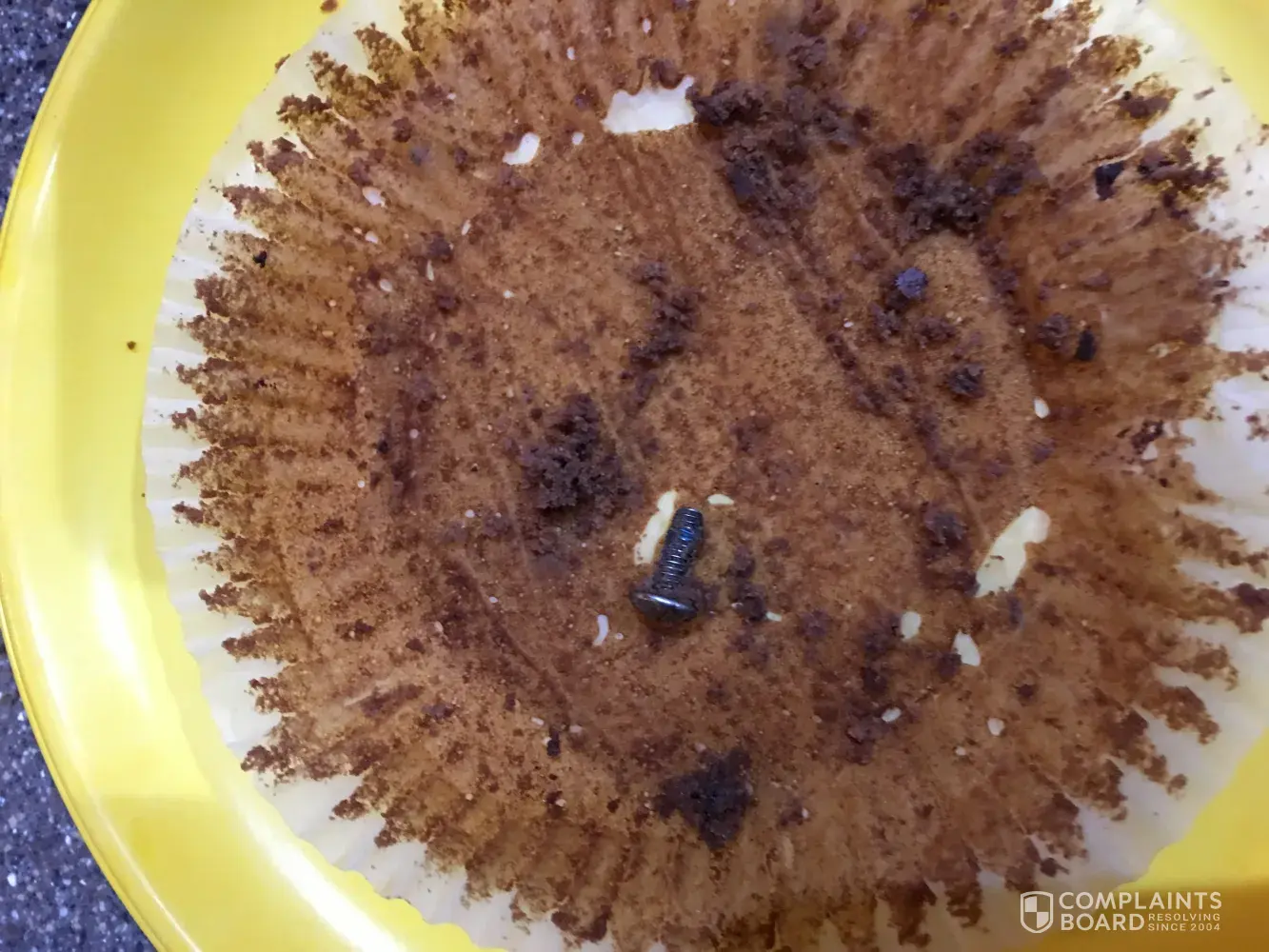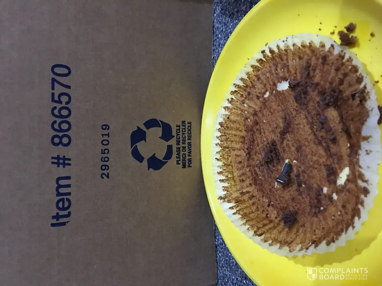 Today (7/25/17) my 13 year old son was eating a chocolate chip muffin that we purchased from the Kenosha/Pleasant Prairie Costco which are usually a beloved snack at our house! When he bit down on something hard. He spit out the bite and we found a screw (hardware/fastener with blue loctite) in the muffin! This is completely unacceptable and a safety hazard. I expect a full 8D/root cause analysis to be included in your response.