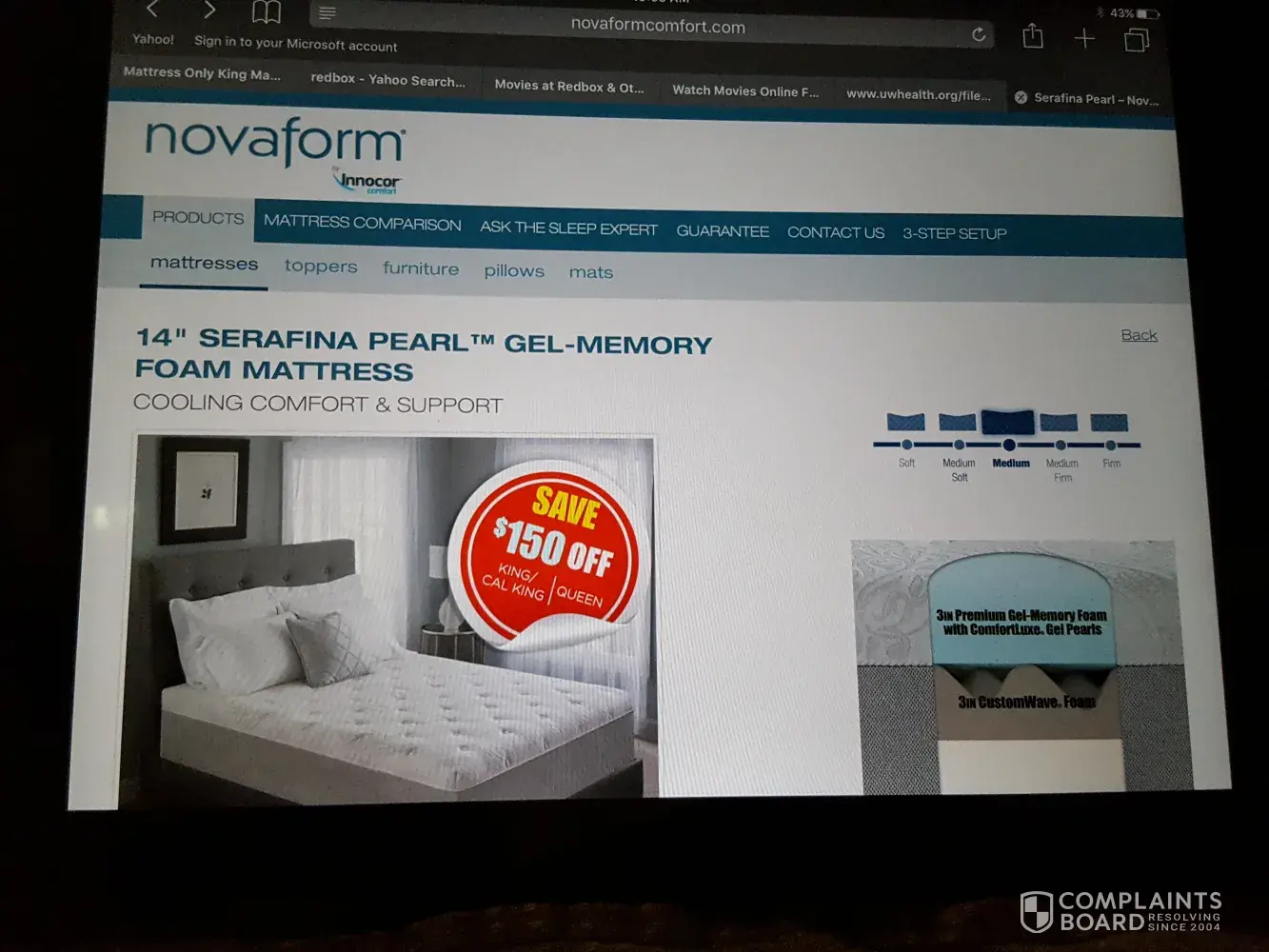 I saw an add on www.novaformcomfort.com with a promo sticker that said $150 off. When I clicked on the shop button it took me to the Costco webpage where there was no discount shown. Novaform customer service at [protected] and spoke to a lady named Sofia. Sofia said she saw that on their website as well and I was told to contact Costco. I contacted Costco and they said they don't see that they have had that sale ever and they don't honor manufacture websites sales. I told her about the picture and by then, roughly ten minutes later, that had been removed off the manufacturer's website. Attached I have a picture of before and another picture of the after, after their web design team was made aware of the false campaign and removed it. I emailed the manufacture & this was their reply: