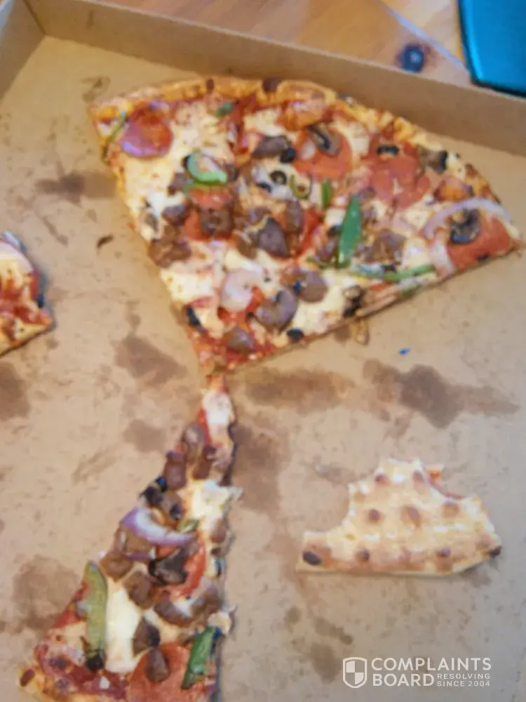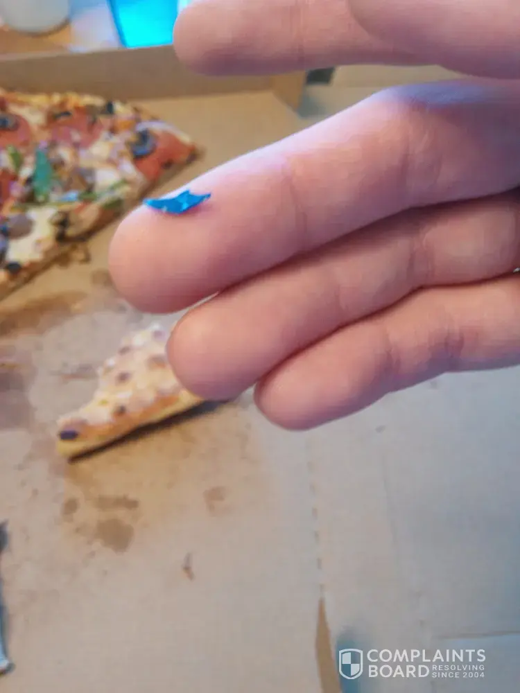We were more than halfway through eating, hope we didn't swallow anything. I wish this is just isolated mistake. Please alert the team of pizza makers, so children cannot be exposed to this kind of mistakes. We like to feel safe eating the pizza we love! Thank you.
