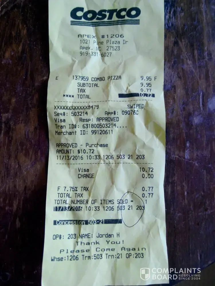 Hi, we bought a combo pizza pie from the Costco, Apex, NC.