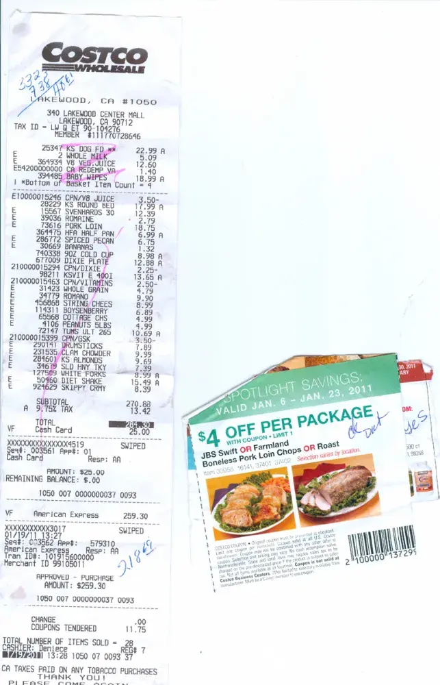 On Wednesday, January 19, 2011 we did some shopping at the Lakewood COSTCO store. Among our grocery list was Pork Loin as we had a $4.00 off coupon. At checkout, all the other coupons were listed on the receipt except for the Pork On the following day, 01/20/2011, we went to the return desk to get credit for the coupon. However we were told the coupon wa...