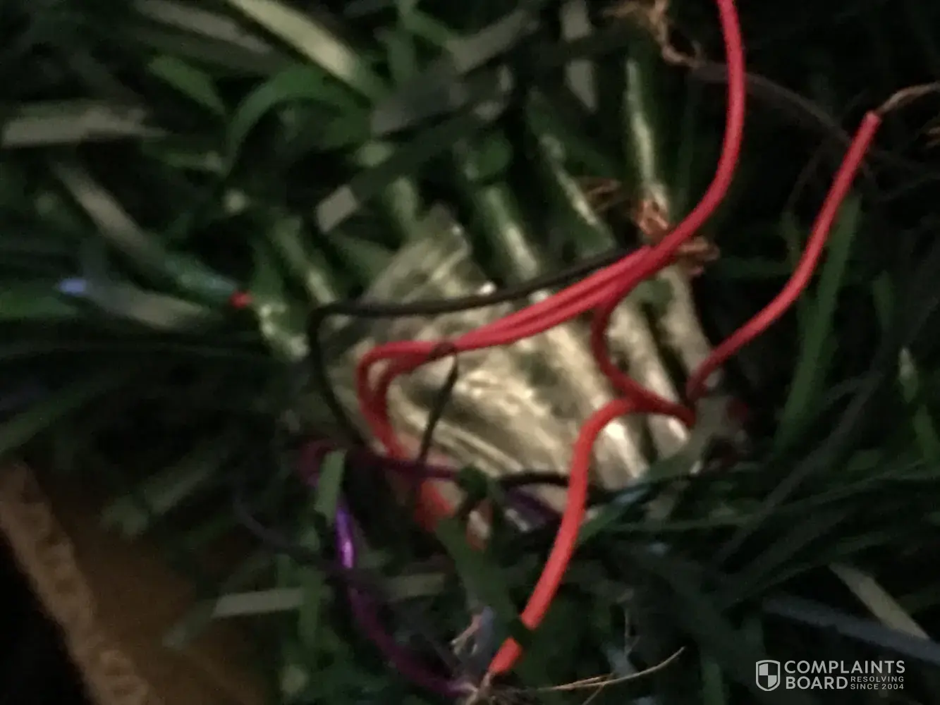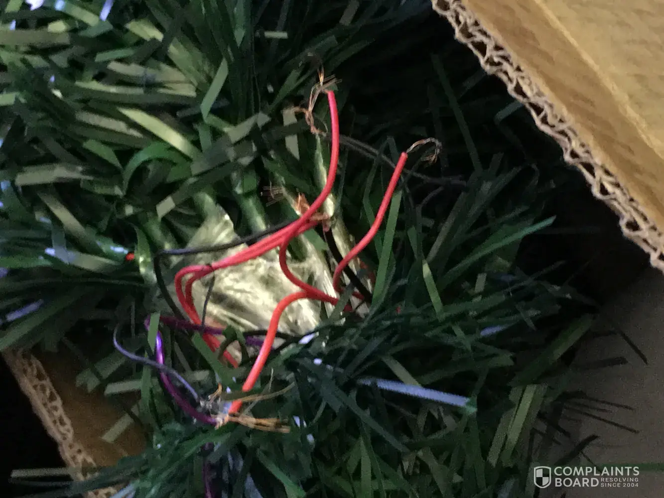 I was sent a defective tree which has exposed wires and sticky with tape. The product is a mess and it was noticeable that this item had been returned by another customer. Inside the box was a note from a woman in Florida requesting full credit. Extremely disappointed with your merchandise. Also missing the so called ornaments (stars). Kathleen Larvey 10 Starling Ave Kingston Ma 02364 Refund my purchase...