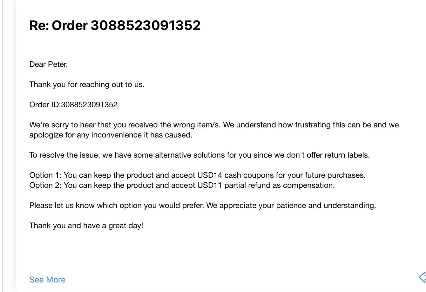 I couldn't believe it when they told me to send the items back and notify them when it had been delivered. It was absurd and made me feel like they were only making excuses. I've come to realize this is just the kind of behavior I should have expected from a scam-based company operating out of Hong Kong. My experience with them has been nothing but an endless stream of disappointment, and I'd never do business with these people again. I urge everyone to avoid Cotosen since their website images are nothing but click baits designed to lure unsuspecting customers. I should have been more cautious and checked for feedback before making a purchase.