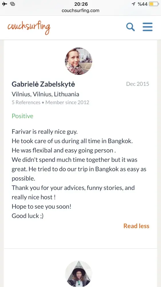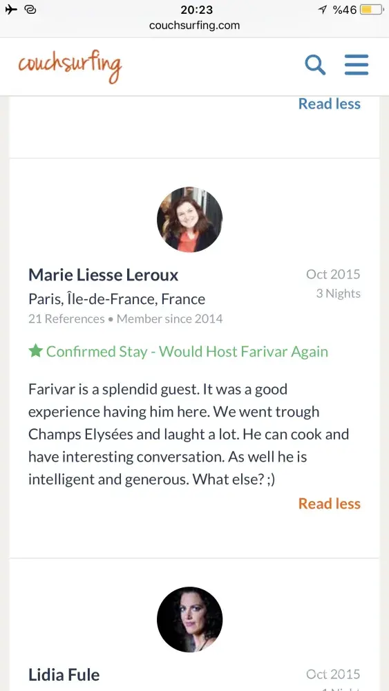 1st . She said "shady and unreliable", "i needed to check if he's not grumpy or not all the time" . She also said "DON'T RECOMMEND THIS PERSON TO ANYONE". I think those words are a kind of defamation, and also against the Terms of Use 4.1.(a), 4.1.(e) on couchsurfing.com.