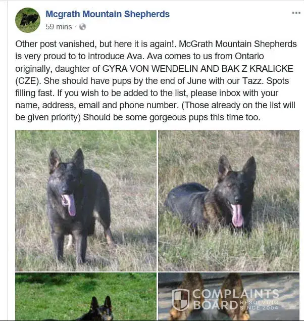 Buyer beware: this dog was purchased from me at countryland german shepherds, april 26, 2018. 2 days ago! Sara hilliard called me to say the dog that she just purchased went to the vet for an utrasound and found possibly to be pregnant I said then she was probably bred to my stud copper because she was with him 3 weeks ago in the kennel I didn't know she was in silent heat since she only was in heat 3 months ago, and you can see copper on my website. She was hoping that eva was bred with loggan but she was never with him, she said ohh that would have been beautiful if she was bred to loggan. Sara hilliard from mcgrath mountain shepherds called me and said she took her to the vet and was surprised that she was bred. Sara told me she is not a breeder and does not know anything in this and was going to buy a dog at first just for companion only and she was surprised that I could sell to her the breeding rights.