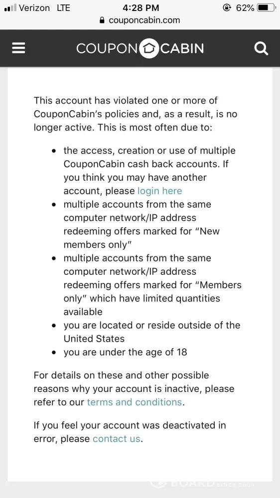 My coupon cabin account was terminated, initially with no explanation, but after several inquiries they insist I violated their policy by having more than one account on my IP address. Absolutely not true. I tried to get them to figure out what glitch in their system caused this error, but they are not interested in resolving it and told me that under no circumstances can my account be restored, nor can I ever have a coupon cabin account again. On my end, I'm concerned that someone hacked my IP address or something, but coupon cabin refused to give me any information about the multiple accounts they claim are used from my IP address. Seems like something shady is going on at coupon cabin.