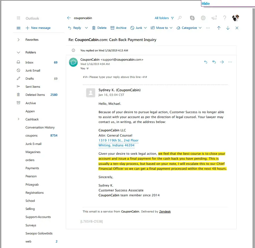 At no point would Sydney K. elaborate on what this "unnatural activity" was, nor has anyone else. In any case, they very clearly did not deem my account to have accrued money by committing fraud, otherwise they would have terminated my account because of that and stated that I would not receive my money because of these concerns. However, Sydney K. plainly stated that my account was in good standing, and that I would receive my money. Therefore, CouponCabin's lawyer very clearly lied to the Attorney General's Office in Indiana just to avoid paying a measly $76.86, which I lawfully earned.