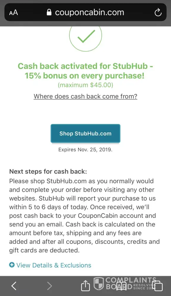 CouponCabin falsely advertised 15% off StubHub tickets and $50.00 cash bonus for purchasing tickets through CouponCabin.com for StubHub. Please see the attached screenshots. I subsequently purchased NBA tickets from each ad, and contacted CouponCabin regarding the status of the discounts. CouponCabin gave me canned responses, and in an email stated: "your order was credited to a different website and not to CouponCabin.com." When I contacted StubHub regarding this issue, StubHub stated that they have no affiliate marketing agreement with CouponCabin! Is StubHub in on this, since they seem to be the financial beneficiary of these false advertisements. I relied on this false ads, then purchased full price tickets through StubHub.