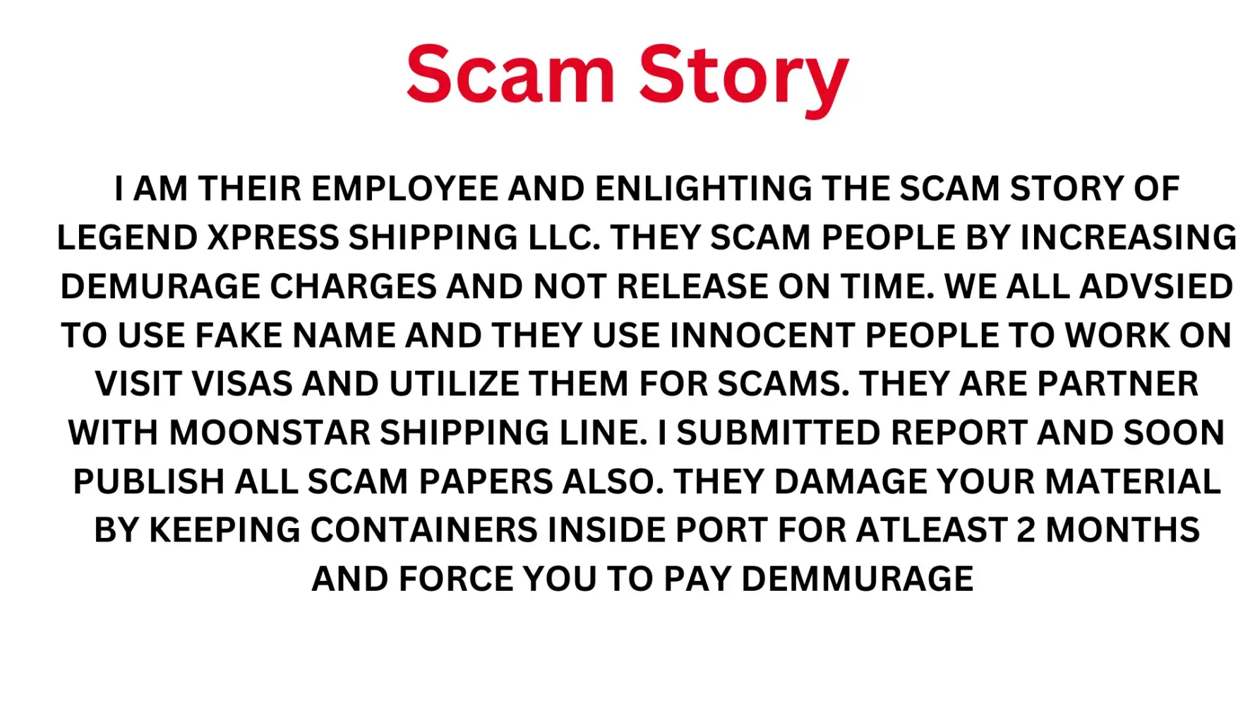 I am their employee and enlighting the scam story of legend xpress shipping llc. They scam people by increasing demurage charges and not release on time. We all advsied to use fake name and they use innocent people to work on visit visas and utilize them for scams. They are partner with moonstar shipping line. I submitted report and soon publish all scam...