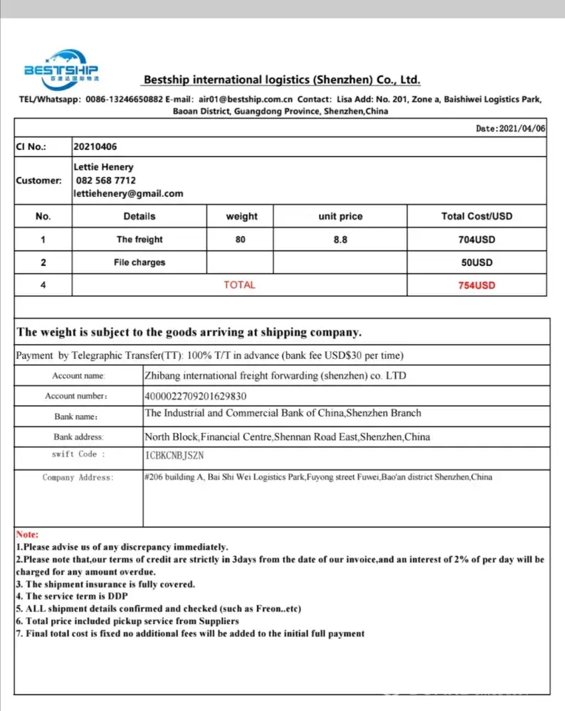 I bought goods from Alibaba. It was 54 sets of regargable airbrush pens for children. I saw Bestship International Logistics on "Made in China" website. They are a gold member. I asked for a quote to transport my 3 boxes to South Africa. Lisa quoted me USD 8/kg. After 4 weeks delay, Lisa emailed me the quote - USD 754. My supplier said the goods weigh 63kg...
