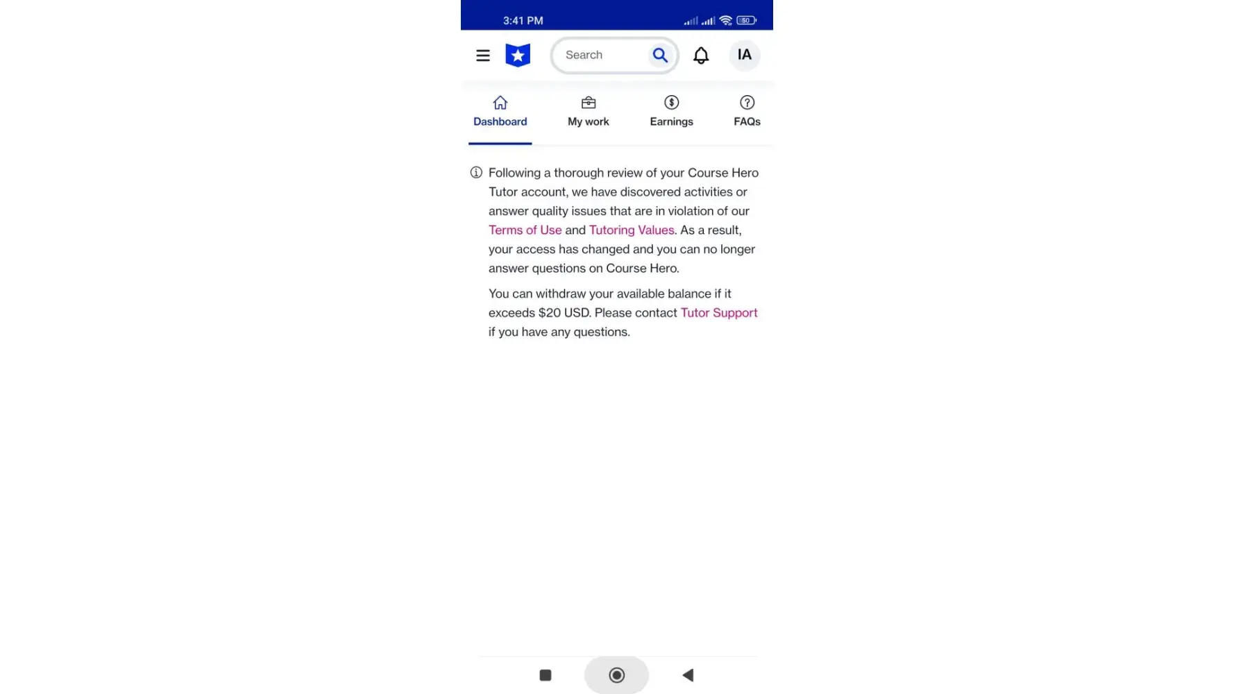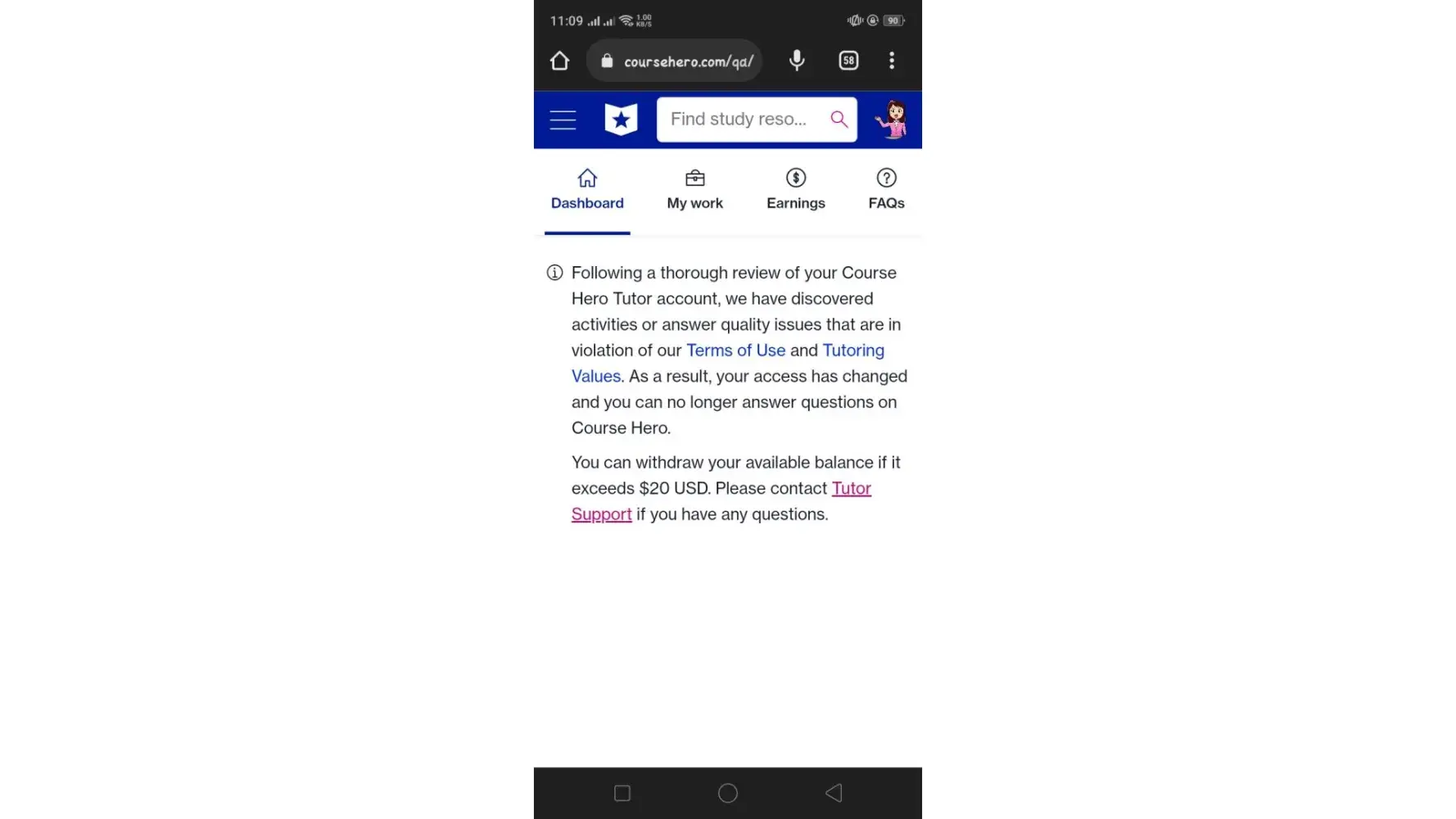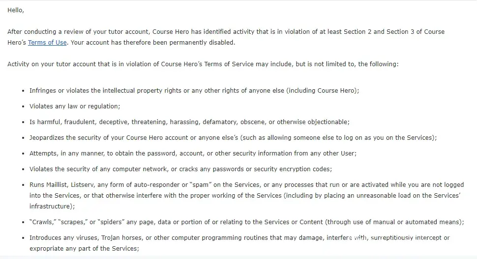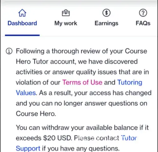 I was selected as a Coursehero tutor in may 2022. I served here with full zeal and energy. I got many helpful ratings, therefore my helpful rating was 90%. On 26 September(2022), there was a pop-up message on my laptop screen showing, "your access has changed and you can no longer questions on Coursehero" and I was unable to withdraw my hard-earned earnings when tried to do so. I was distressed because I was unable to withdraw my 150$ balance. I emailed Coursehero tutor support team and they replied me with the following system generated email: