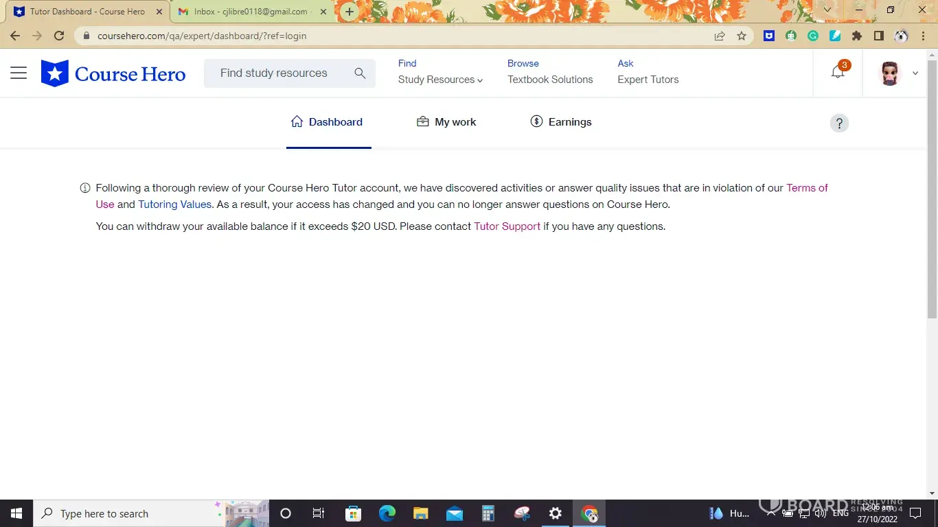 I have been a tutor on course hero for 3 years. This is the first time that I've experienced something like this. I simply wanted to withdraw my earnings on October 26, 2022, but I did not receive the verification code, so I changed my verification number, but the result was my account was locked. When I go to the dashboard, it says I can no longer answer a question. My rating is pretty decent and I haven't received any email that I violated any policies, of course hero.