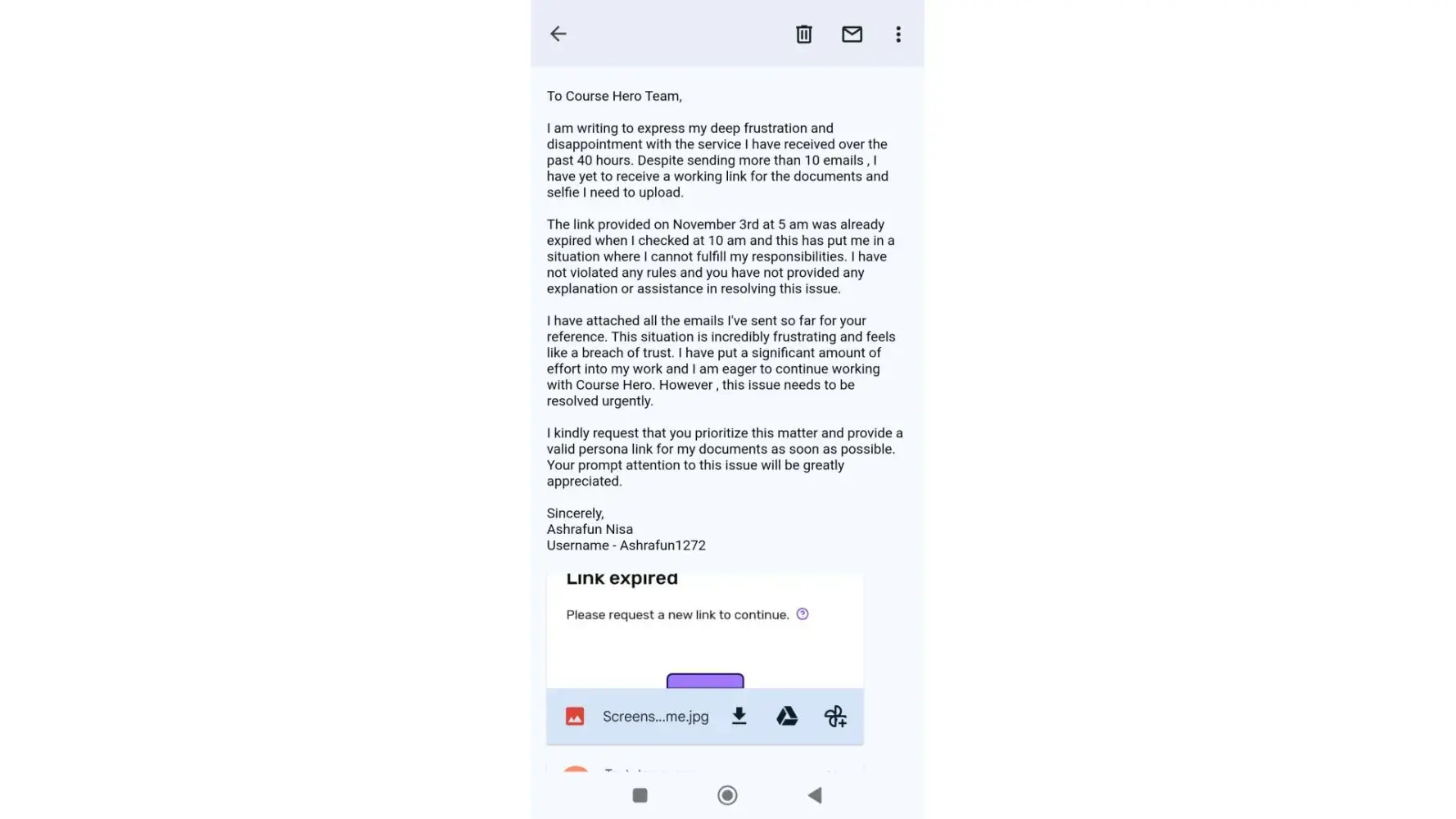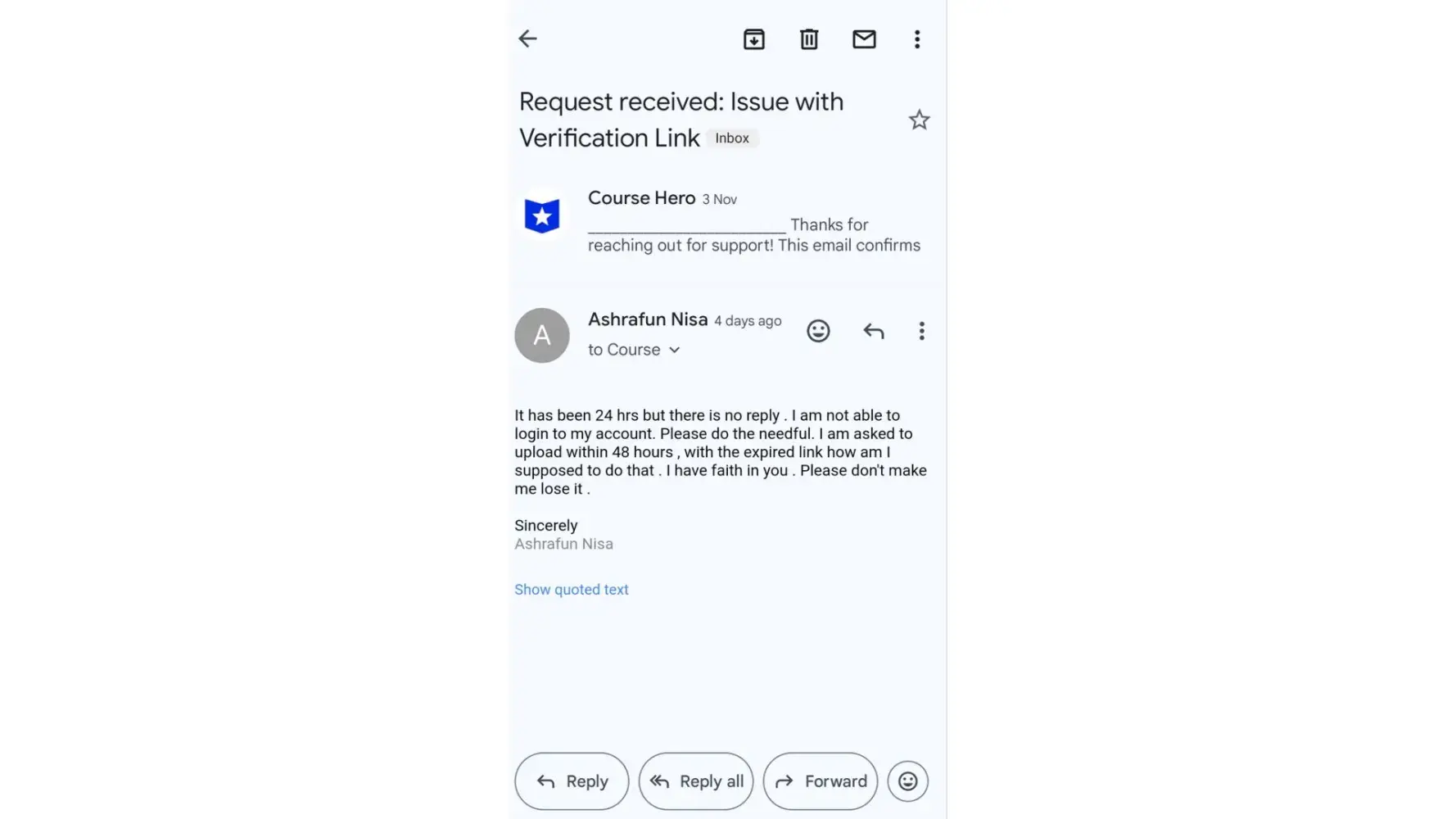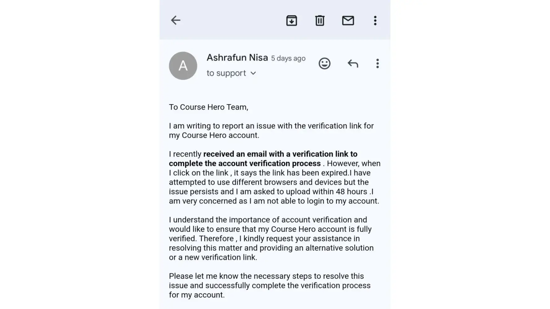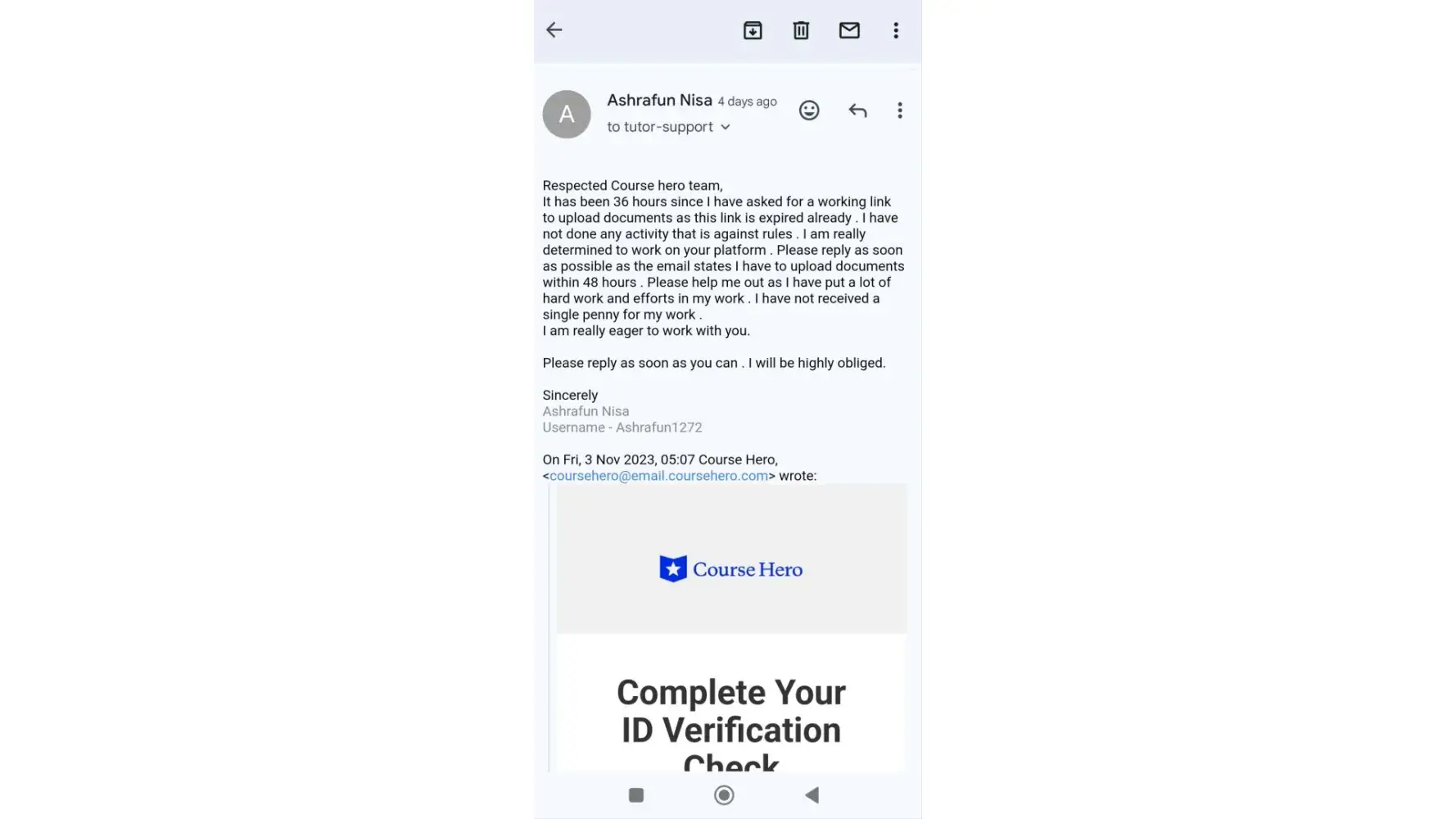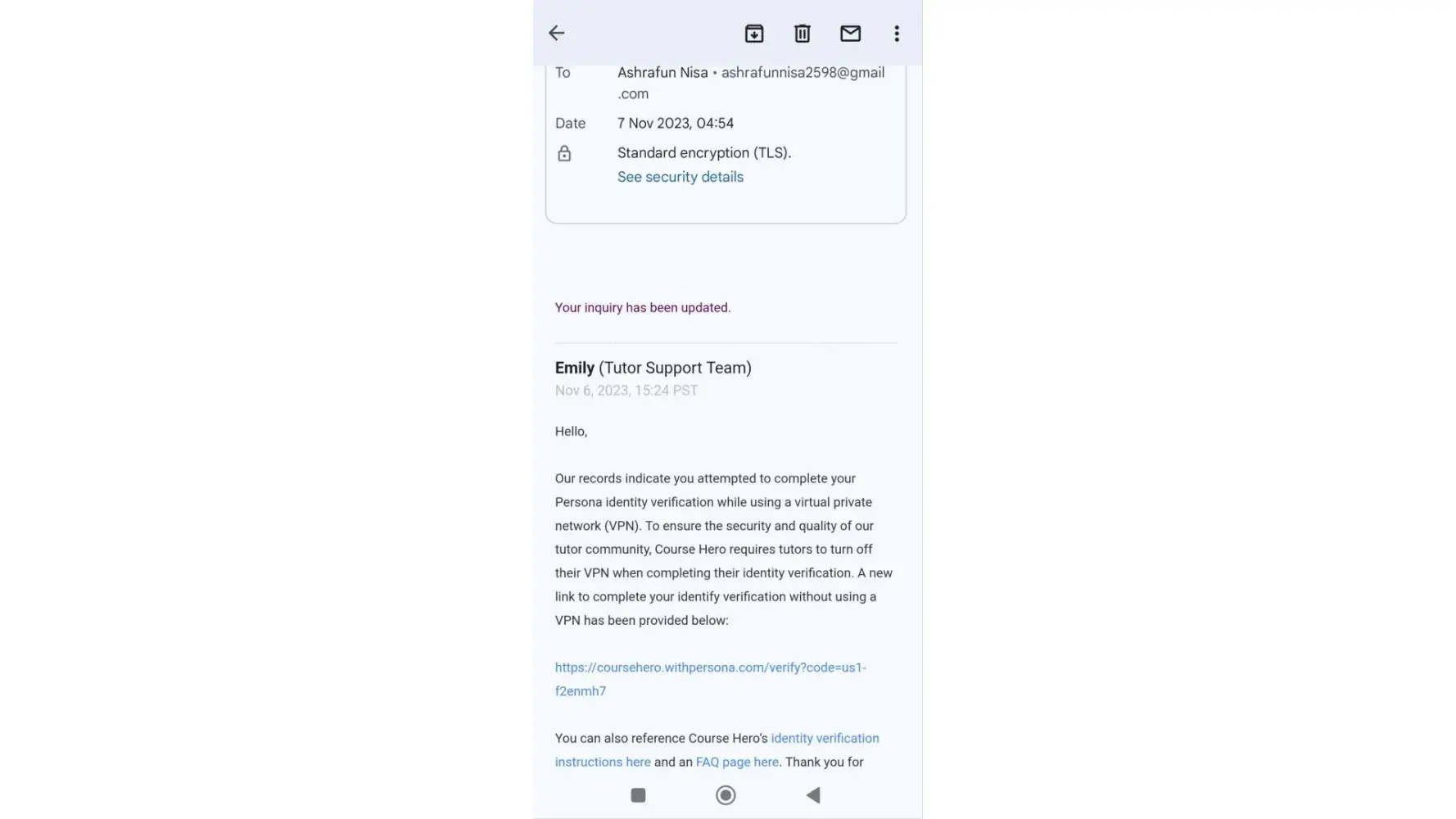 I, Ashrafun Nisa , contacted on [protected]@coursehero.com again and again that provided link for re-verification is expired so how am I supposed to re-verify but they didn't reply and then I contacted on Complaints Board then Ms Emily from Tutor Support Team replied and gave my new persona link for re-verification and wrote that I used VPN in last...