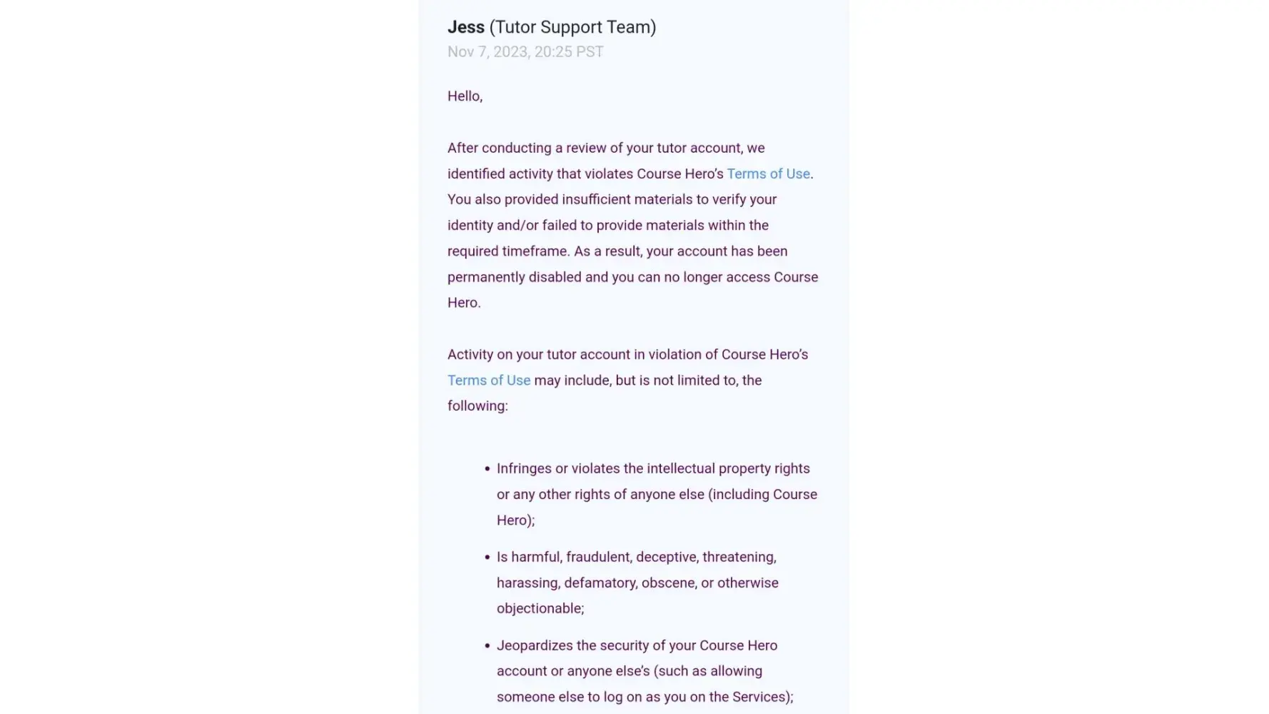 Today I have received an email telling me that my tutor account has been temporarily disabled because, according to them, they have identified unusual activity on your Course Hero tutor account that violates our terms of use. They've asked me to submit 3 items to re-verify my account within the next 48 hours. I have send all items today afternoon and at 11 pm norch fronm tutor support team sent mail that your account is permanently disabled. But I have already send all items
