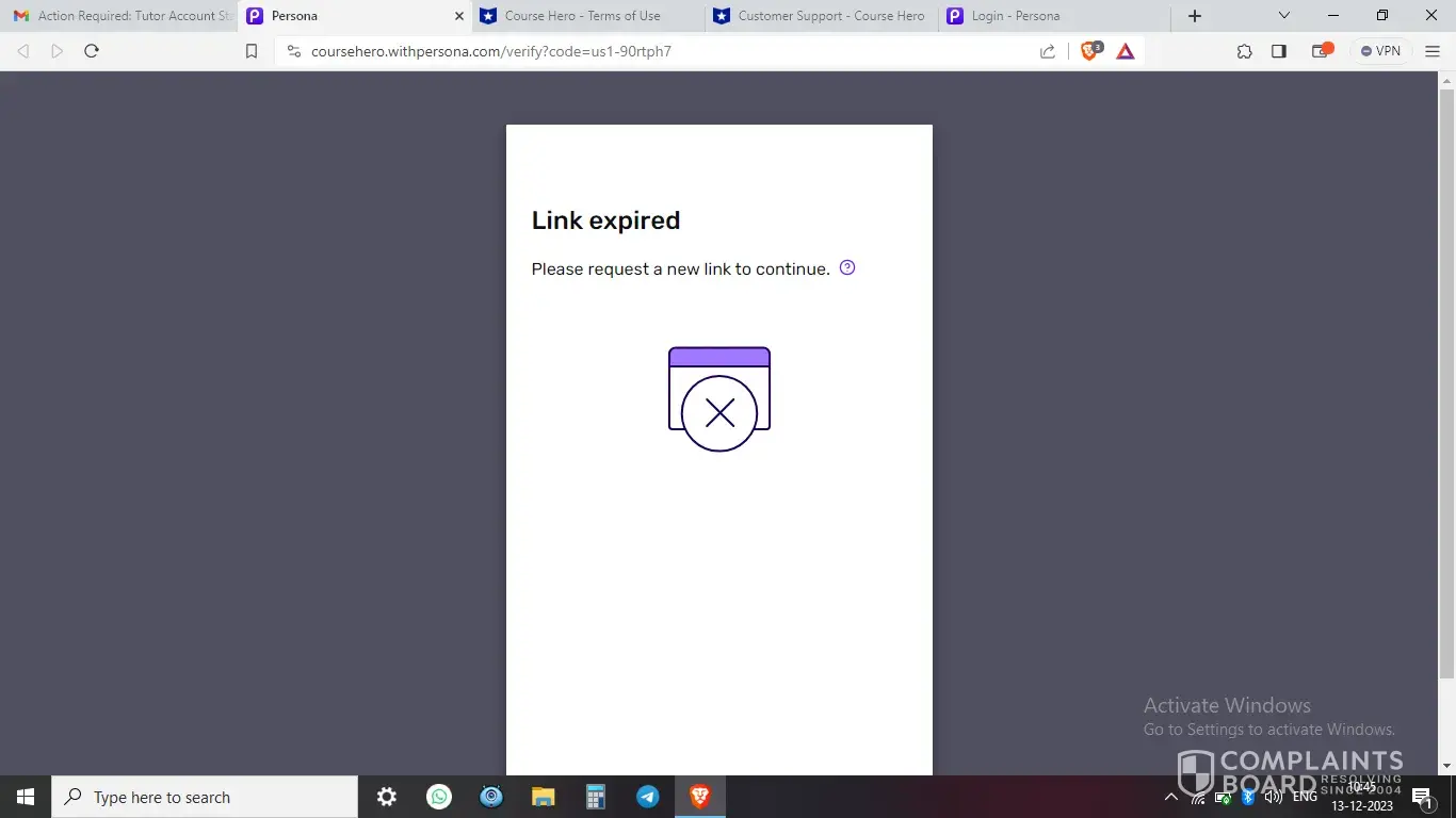 Same happened with me on Nov 3 and they provided me expired me link too and then after many complaints they gave me new persona link on Nov 7 so I completed re-verification within 12 minutes and when I checked later that link got expired too within half an hour only while stating that this link is valid for 48 hours . Fortunately, I completed the process then and there . But still on Nov 8 they permanently disabled my account saying that we will not give any additional information. This is final decision. Now they are not responding on tutor-support@coursehero.com and on helpline +[protected] since then . I solved 148 questions and earned around $ 295 but could not withdraw single dollar . I met 100+ people on YouTube and Instagram and Twitter who got scammed like me only . They charge students to ask questions and appoint us to solve them and disable our accounts to keep money with themselves and appoint new tutors . Kindly file a complaint legally as well on job/employment scam and on Federal Trade commission and BBB and aware people on social media and make sure you get your hard earned money . I am also waiting for Complaints Board reply .