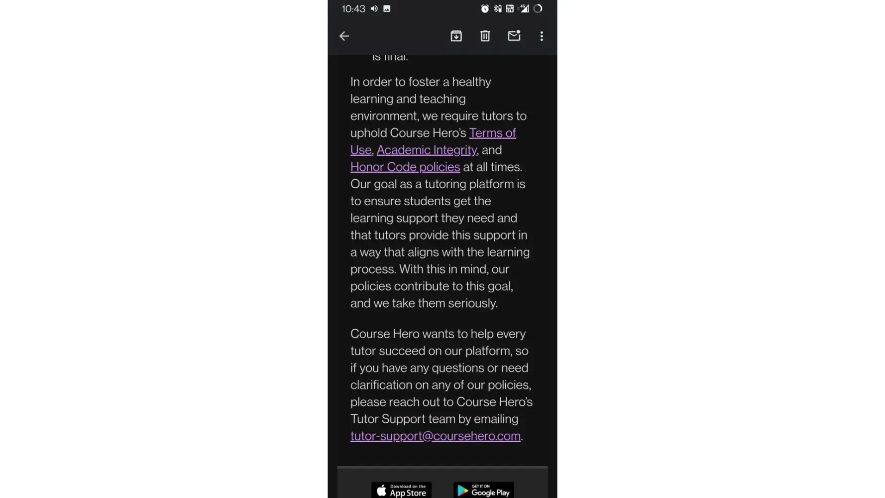 Now you will receive a reply that contact on tutor-support@coursehero.com . We can only help you there . But this is just fool you and other complainants. They don't help and on Twitter I was asked to contact on 24/7 available helpline +[protected] and when I contacted and spoke to Ms Anna she just denied to help me as soon she heard tutor account disabled complaint and said we just help students inquiries.