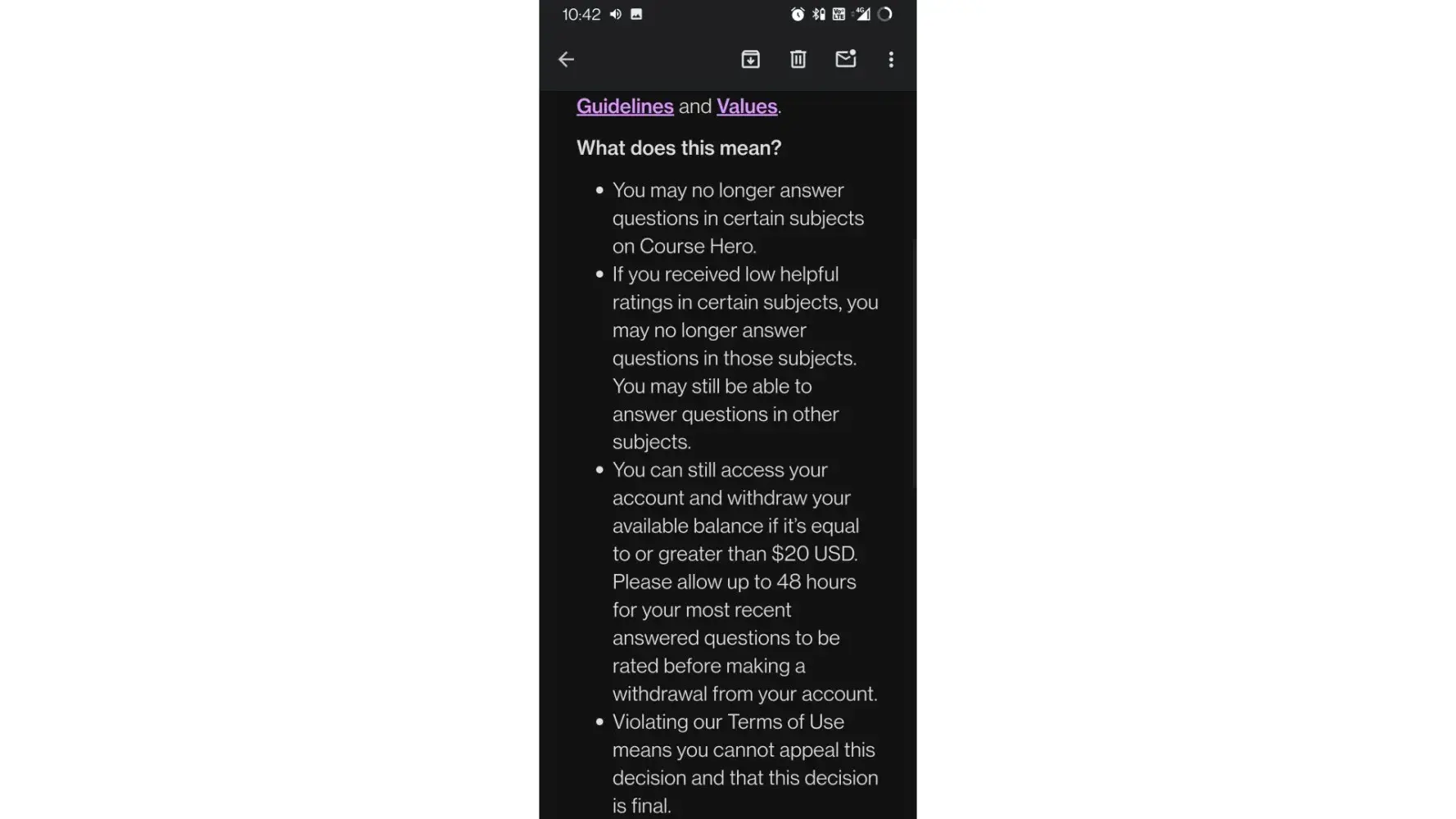 Claimed loss: My accounts rights for solving questions was revoked so that I can't answer any more questions. Students love my answers and by doing this, Course Hero is hurting the students too.