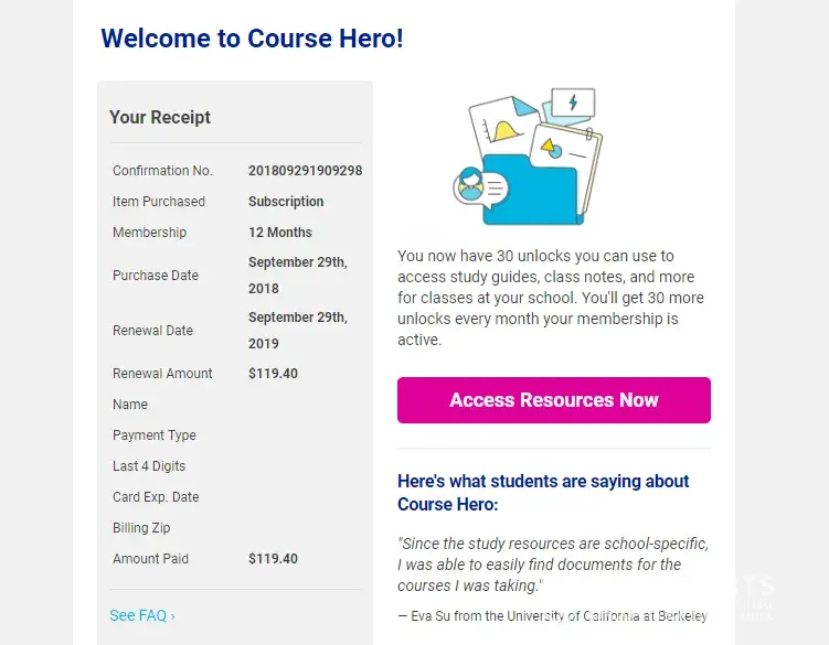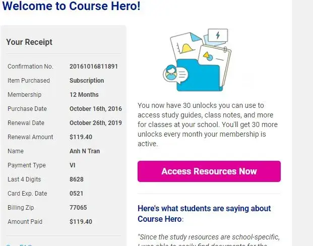 However, I did not know the card information is still in the account, and Coursehero automatically withdrew money from it without my consent. The unwanted charge happened today October 25th, 2018.