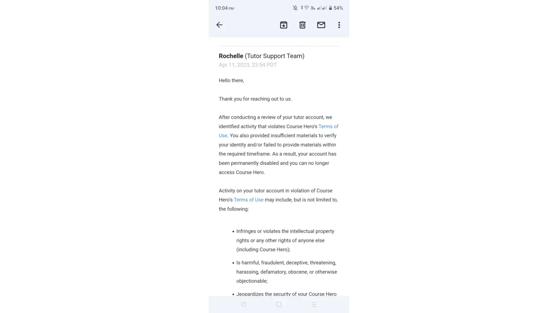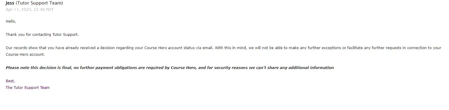 Hello there,Thank you for contacting Course Hero Tutor Support. Upon checking, our records show that your account has been permanently closed for violating Course Hero’s Terms of Use. This decision is final and we won’t be able to re-open your account. Please also note that no further payments are obligated at this time.We will not be able to make any further exceptions or facilitate any further requests in connection to this account."