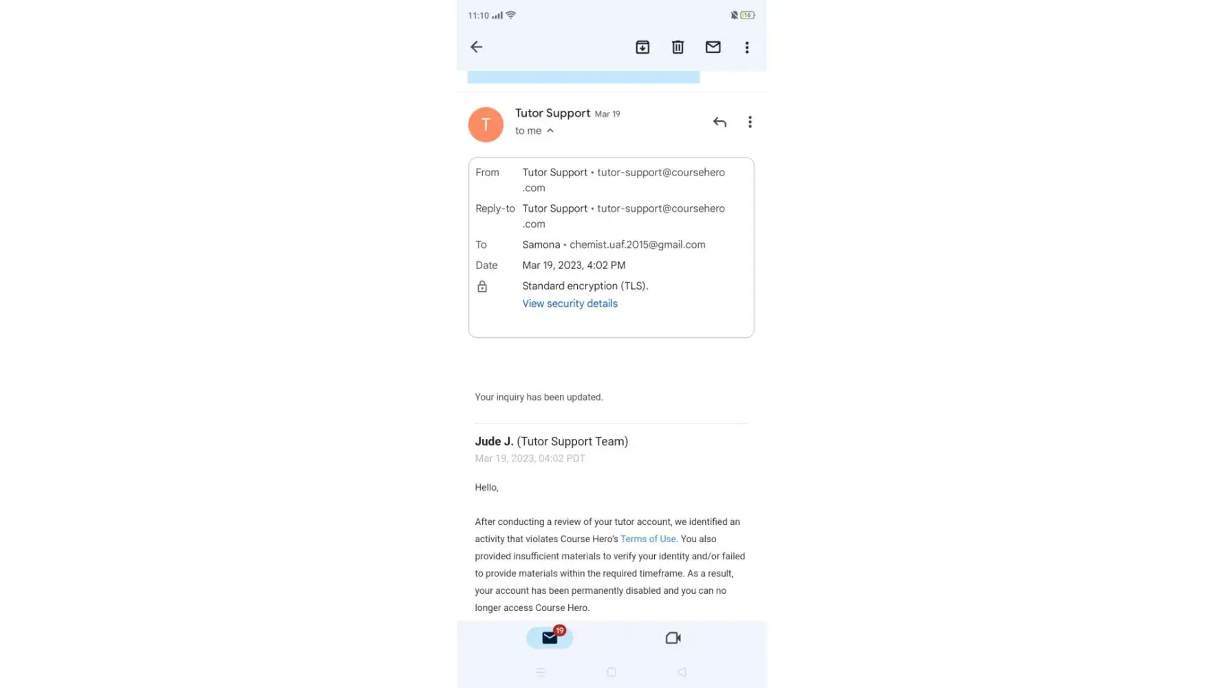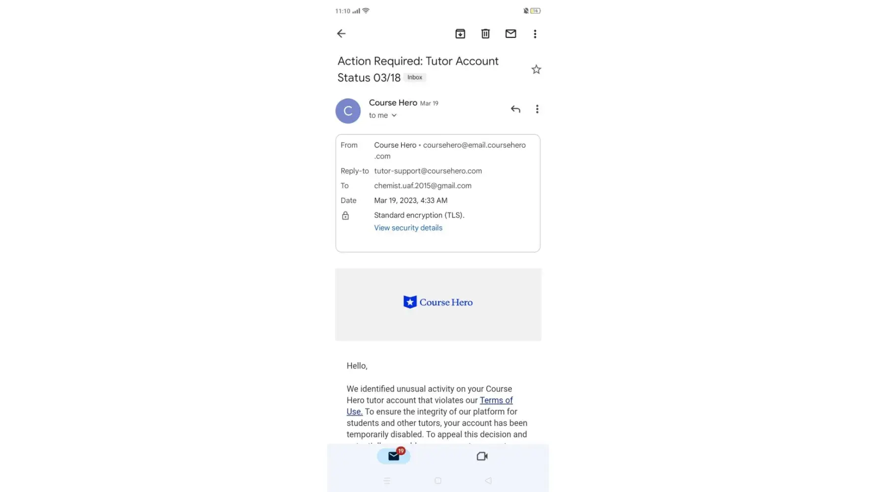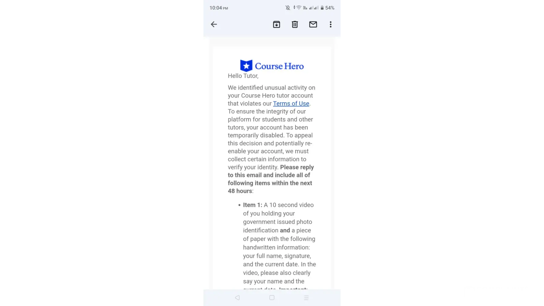 My account in Tutor was suddenly banned PERMANENTLY with my hard-earned money of more than $79 (from the last time I have seen it) and still expecting more than $25 to be received once accepted by my students. They have notified me that "We identified unusual activity on your Course Hero tutor account that violates our Terms of Use" in which I did not in any way. So as instructed, I went to submit the necessary information containing my government ID, a paper with my name, signature, and date of when I created the video, as well my registered email and number. And they responded with "After conducting a review of your tutor account, we identified activity that violates Course Hero’s Terms of Use. You also provided insufficient materials to verify your identity and/or failed to provide materials within the required timeframe. As a result, your account has been permanently disabled and you can no longer access Course Hero." Like WTF? I gave everything they asked to reactivate just 1 HOUR AFTER THEY NOTICED and didn't violate anything in their terms or anything. I contacted back their support team ([protected]@coursehero.com) and responded that it was final and will no longer be amended "Please note this decision is final, no further payment obligations are required by Course Hero, and for security reasons we can’t share any additional information". Clearly a TRUE SCAM when your earnings through this platform increase, they will do their best to rip you off it and just create a random scenario that you will that will unable you to get what you earned hard.