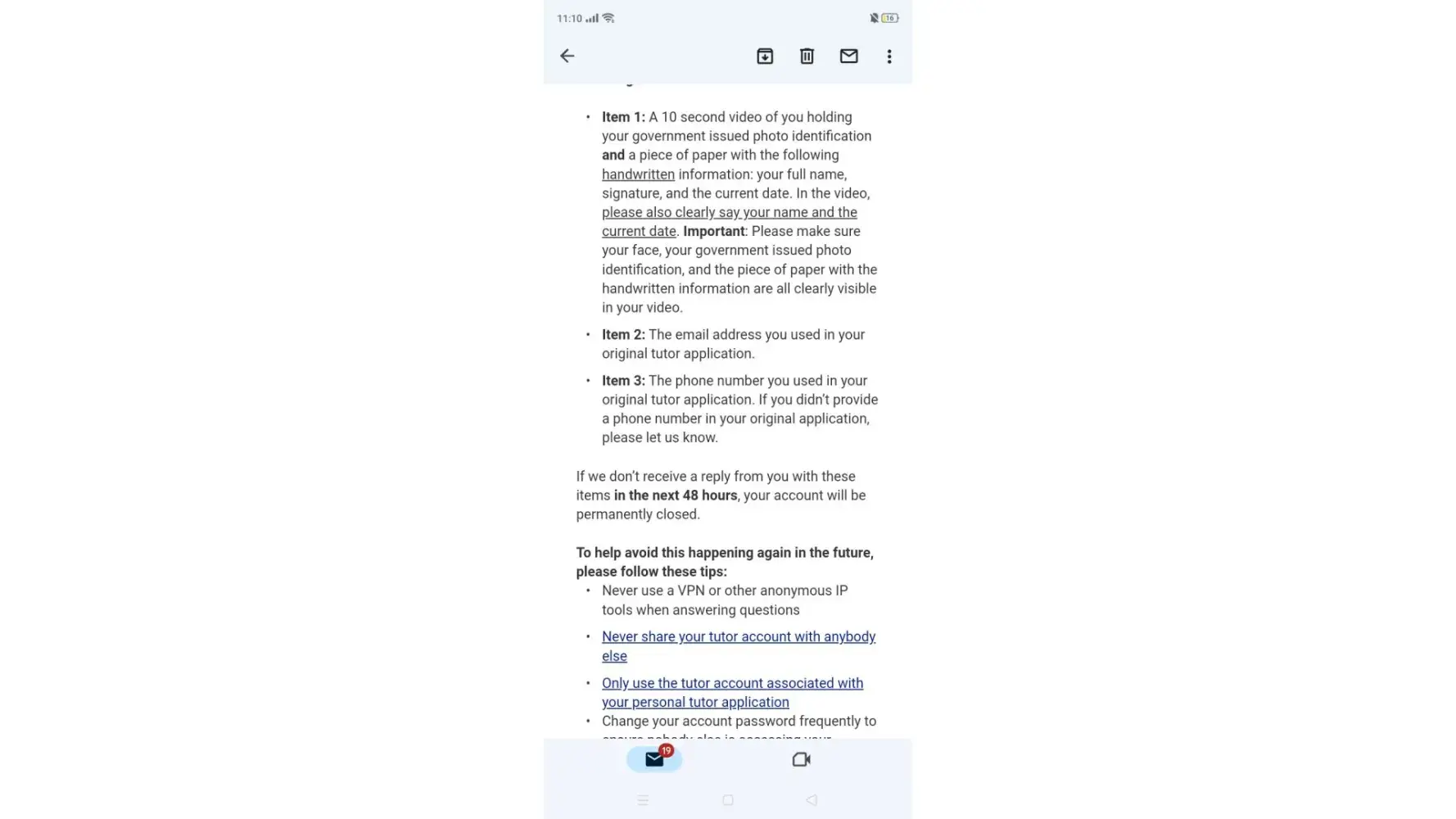 I know it's an automatic message they send, I did my research online and this has not only happened to me, there are a lot of tutors that got their account suspended and when they asked, they said the same thing.