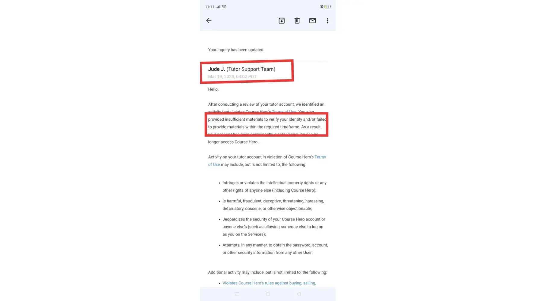 On April 19 I suddenly received email of temporary disabled account from course hero. They ask me to provide some documents I provided before time limit. But at the same day the email me to permanently disable account. They said I didn't provide documents with time frame. Although it's not correct. I am attaching screenshots of email. It is wrong to ban account without any reason or warning.