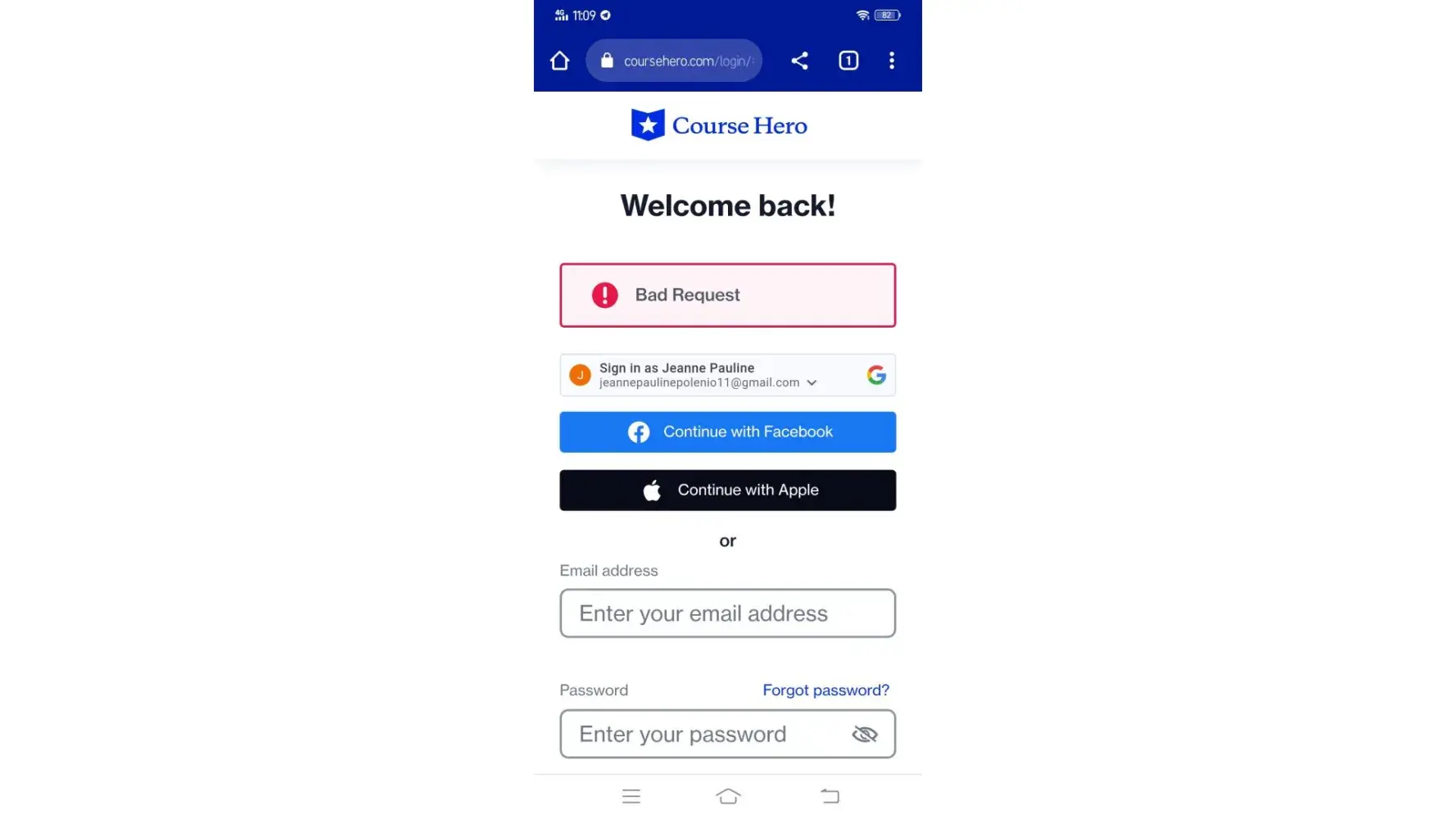 Course Hero Bad request while logging in