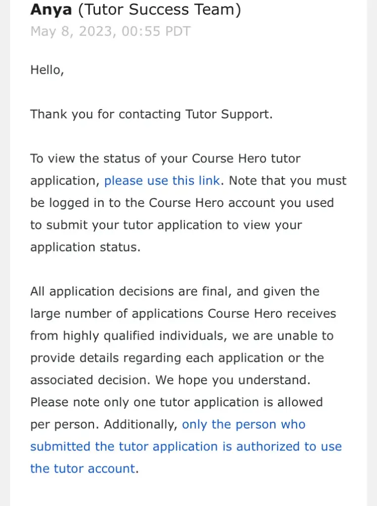 I have sent an email to the [protected]@coursehero.com multiple times now. My emails are not responded. I even emailed them Last February 8, but I still received no response. The automated reply keeps on saying that the application has been received but It's already in April but still no response on whether my application was denied or whatnot. I have already sent all the requirements necessary for the application.