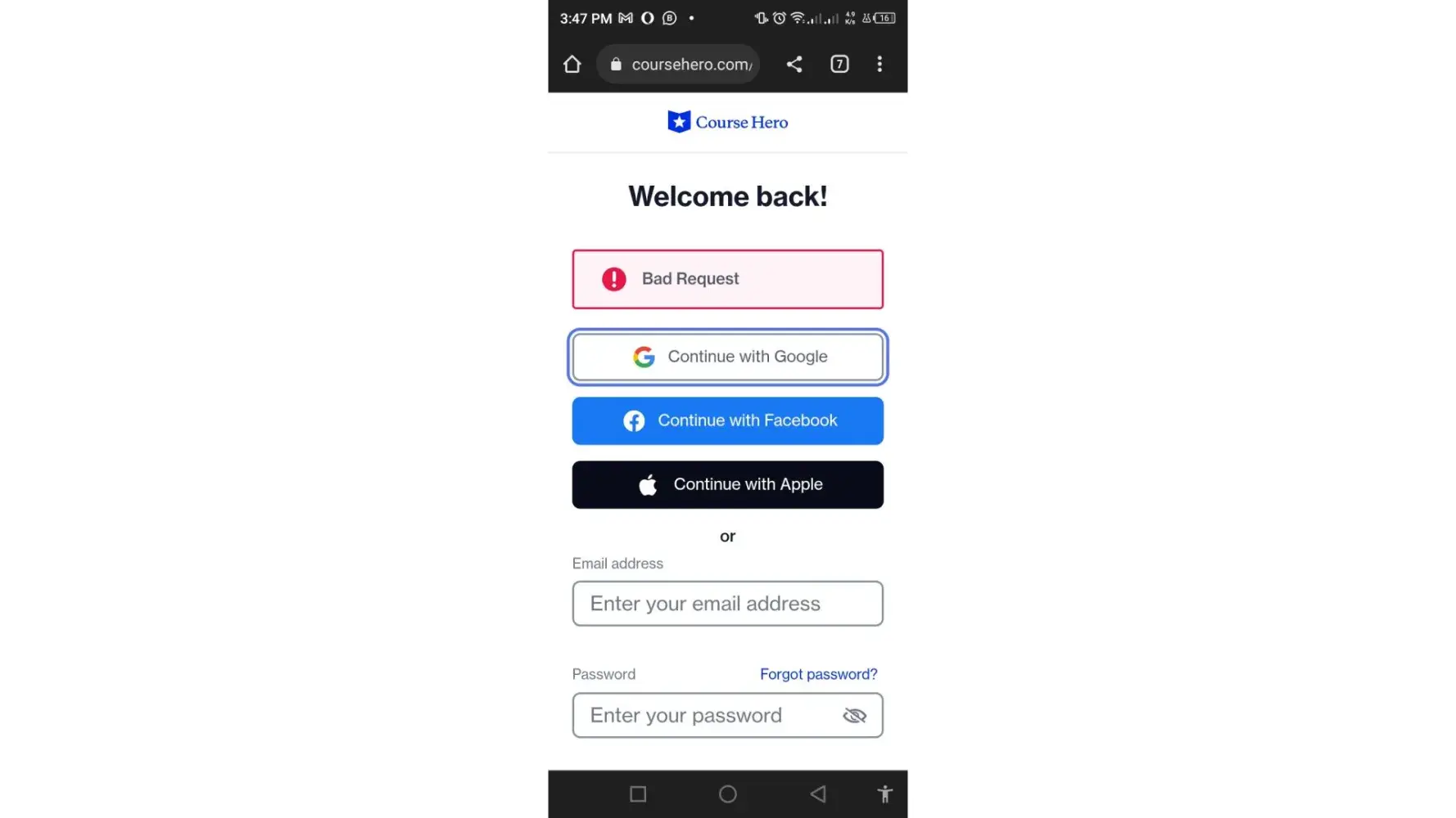 I am facing troubles while login into course hero account through google and popped out "bad request"