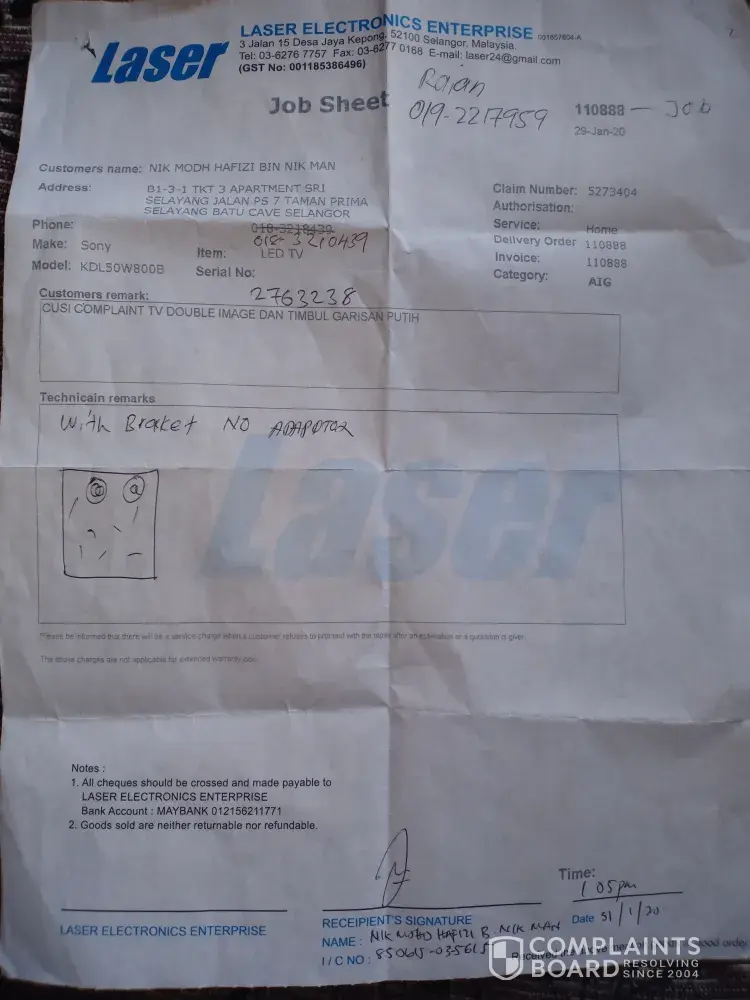 Hello, saya buat laporan tv rosak & tv telah Di ambil oleh technician pada 31/1/2020 jam 1.05pm oleh sebuah syarikat laser electronic enterprise. Masalah sekarang sampai sekarang tv saya belum siap, why take too long for repairing. Last update from them say no spare part, 3 week only check for spare parts. Buat keje lembap, dah la tak update saya, asyik saya je call Tanya. Itu Hari cakap Ada spare parts, last-last 3 week tunggu cakap tak Ada spare parts. Tolong settle cepat, 3 minggu tak Ada tv beli dah la mahal. PLEASE DO SOMETHING. THANKS