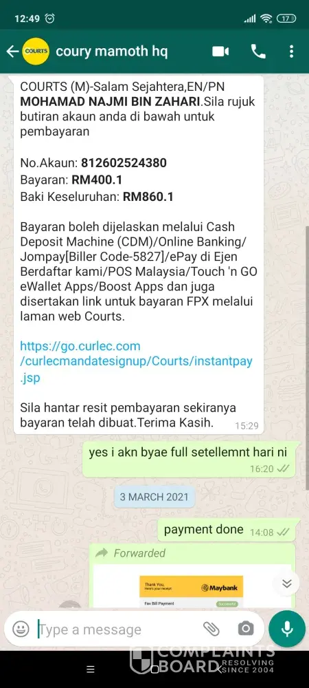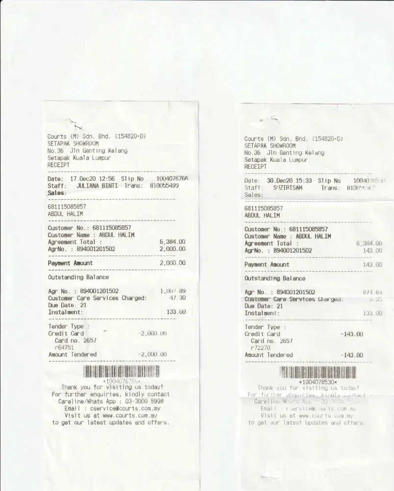 I am Abdul Halim Bin Abdul Hamid ([protected]). Upon contacted by a Courts collection agent, I have made a full payment of my long past due, based on full settlement discounted amount as mentioned by the agent, of RM2, 000 + RM143 (claimed to be a legal fee) on the 17/12/2020 and 30/12/2020 respectively. Both payments were made at the Courts Jalan Genting Klang, Setapak Kuala Lumpur.